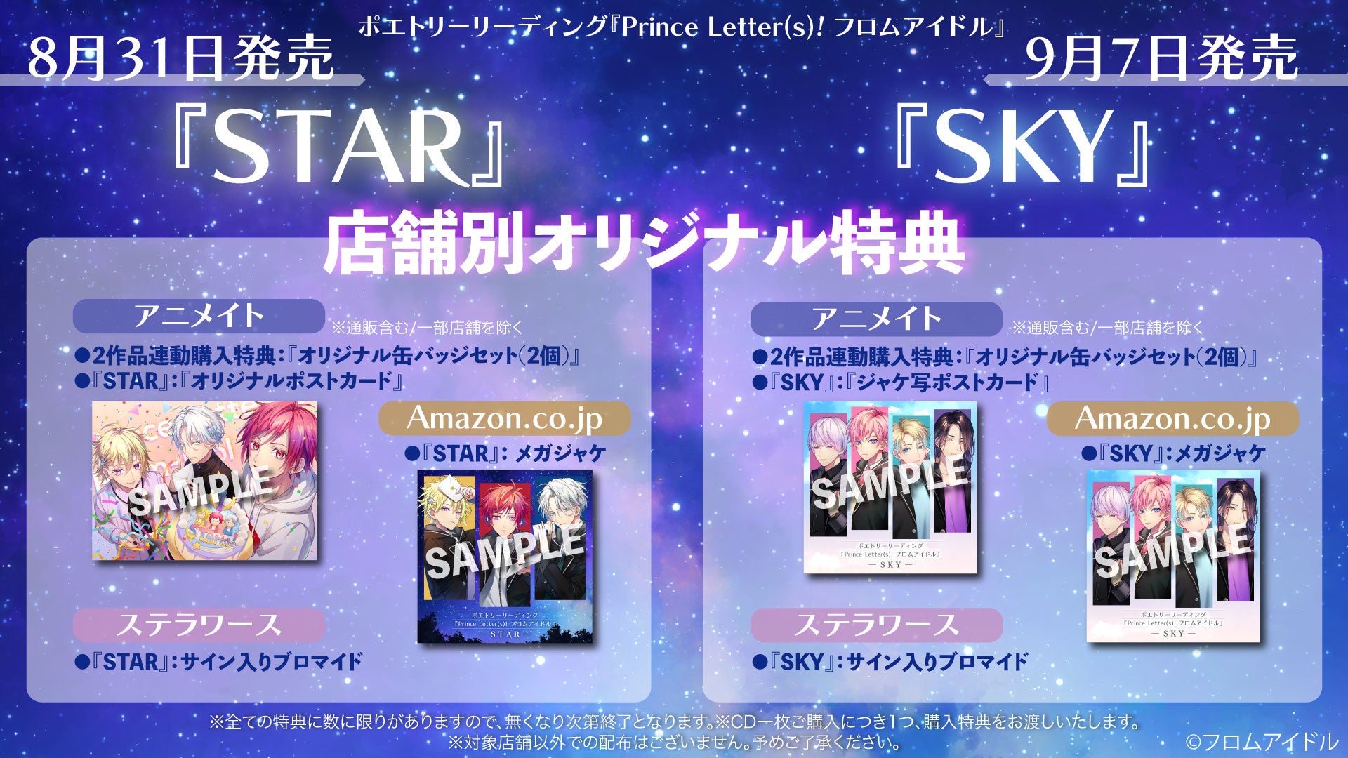 2 枚目は 9 月 7 日発売の 2nd シーズンから登場した鏑木シュウ、鋳田寿ナツトラによる「柊虎の話」や、放送部に所属するハルキ、アオイによる CD 初解禁の新曲「ハルキの話」、「アオイの話」を収録した「ポエトリーリーディング『Prince Letter(s)! フロムアイドル』-SKY-」。