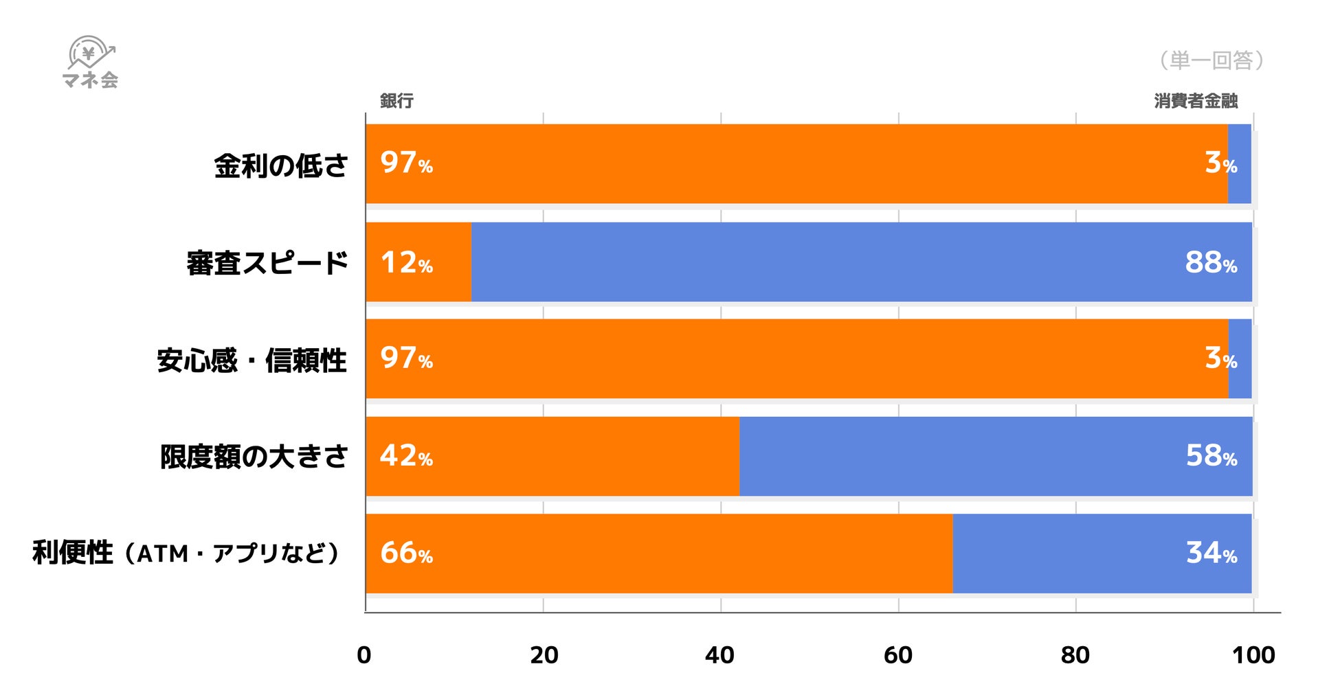 ・安心感・信頼性:銀行が優勢(銀行 97%、消費者金融 3%)