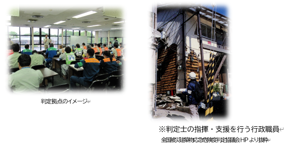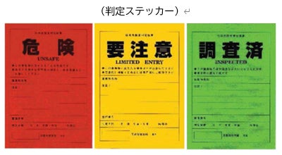 大規模地震発生後、人命に関わる二次的災害を防止するため、地震により被災した建築物について、その後の余震等による倒壊の危険性を判定し、その判定結果に応じた、判定ステッカーを掲示することにより、居住者及び付近を通行する歩行者に対して建物の危険性について情報提供するものです。