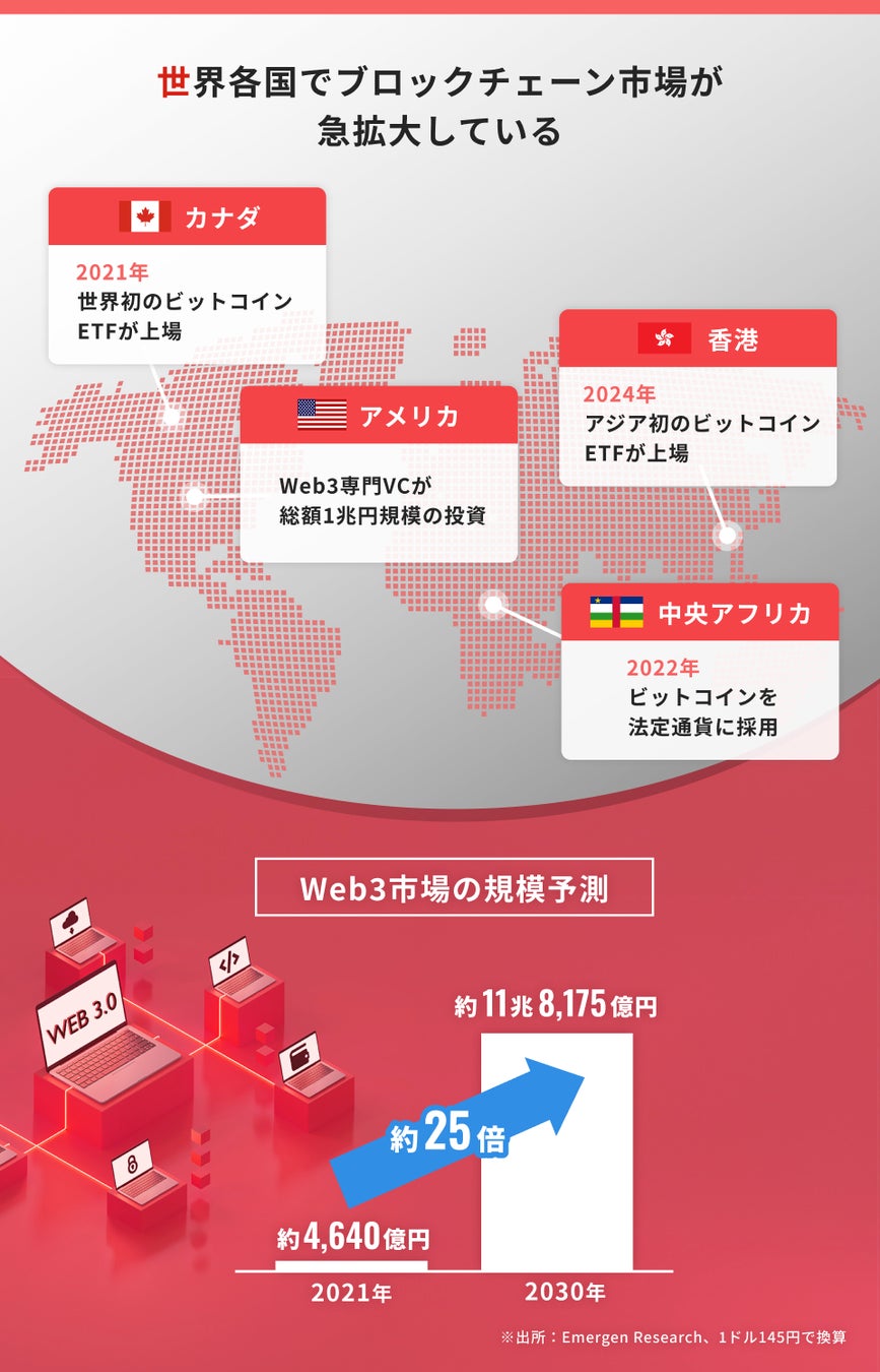 Web3市場は2021年時点で約4,640億円、2030年にかけて約11兆8,175億円にまで達すると予測されています。日本政府もブロックチェーン技術を国家戦略の一環として位置づけ、金融庁が国内ETFの承認や税率の引き下げを検討していると報道されるなど、世界各国でブロックチェーン技術の活用が急拡大しています。