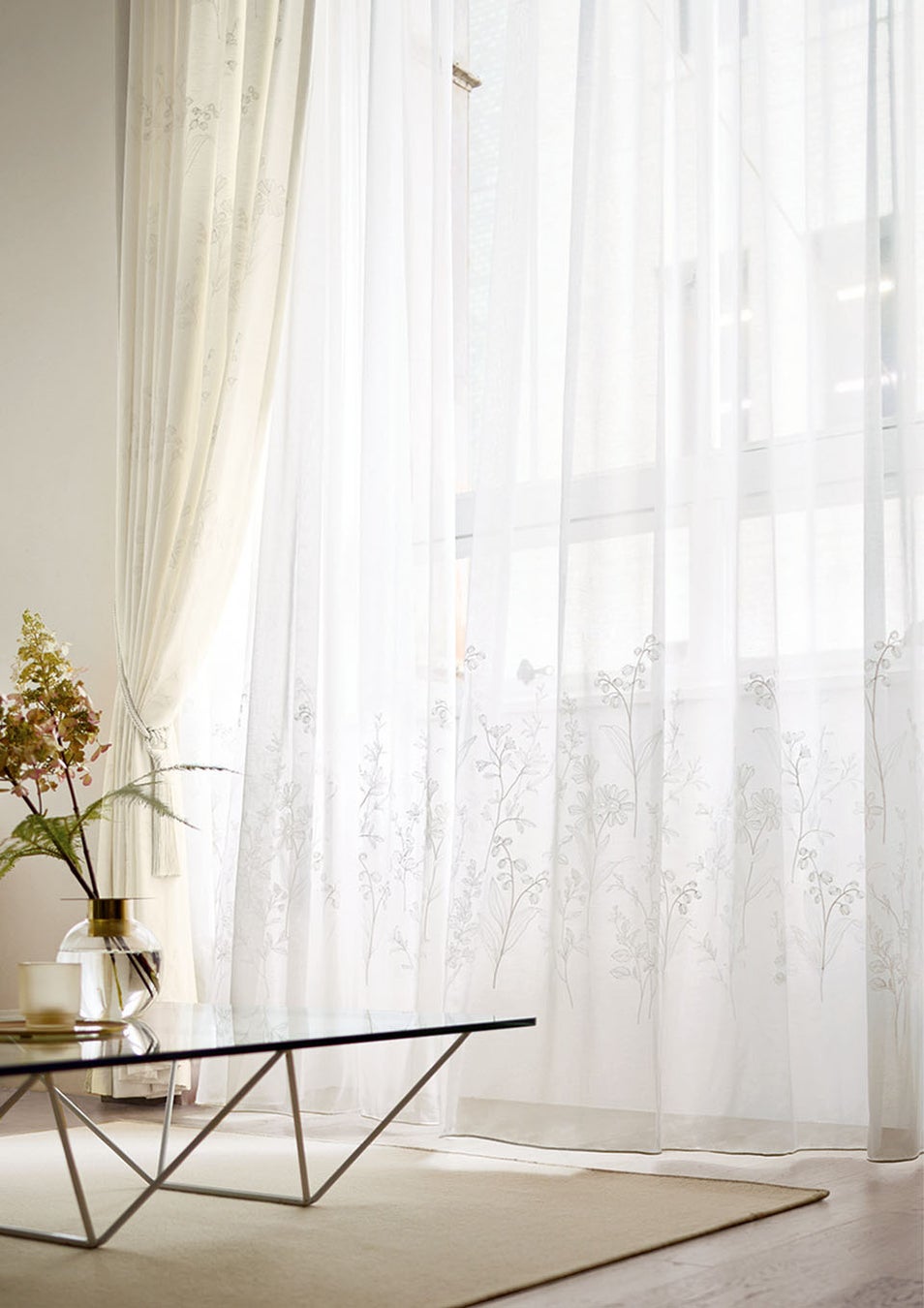 植物モチーフを上品にアレンジした刺繍を施したデザインシアー