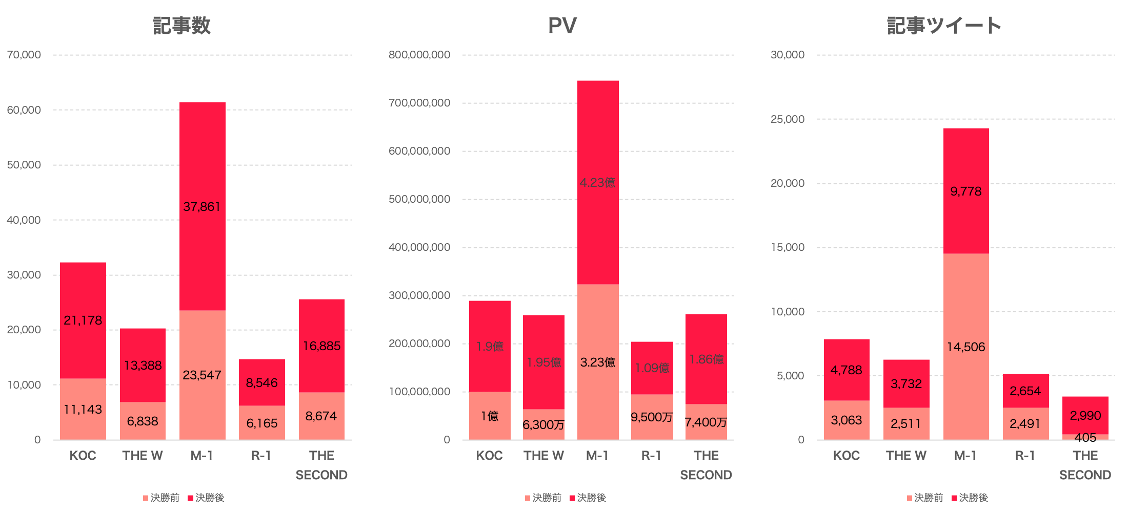 - 記事数とPVの規模では、THE SECONDは1位M-1、2位キングオブコントを追う立ち位置。