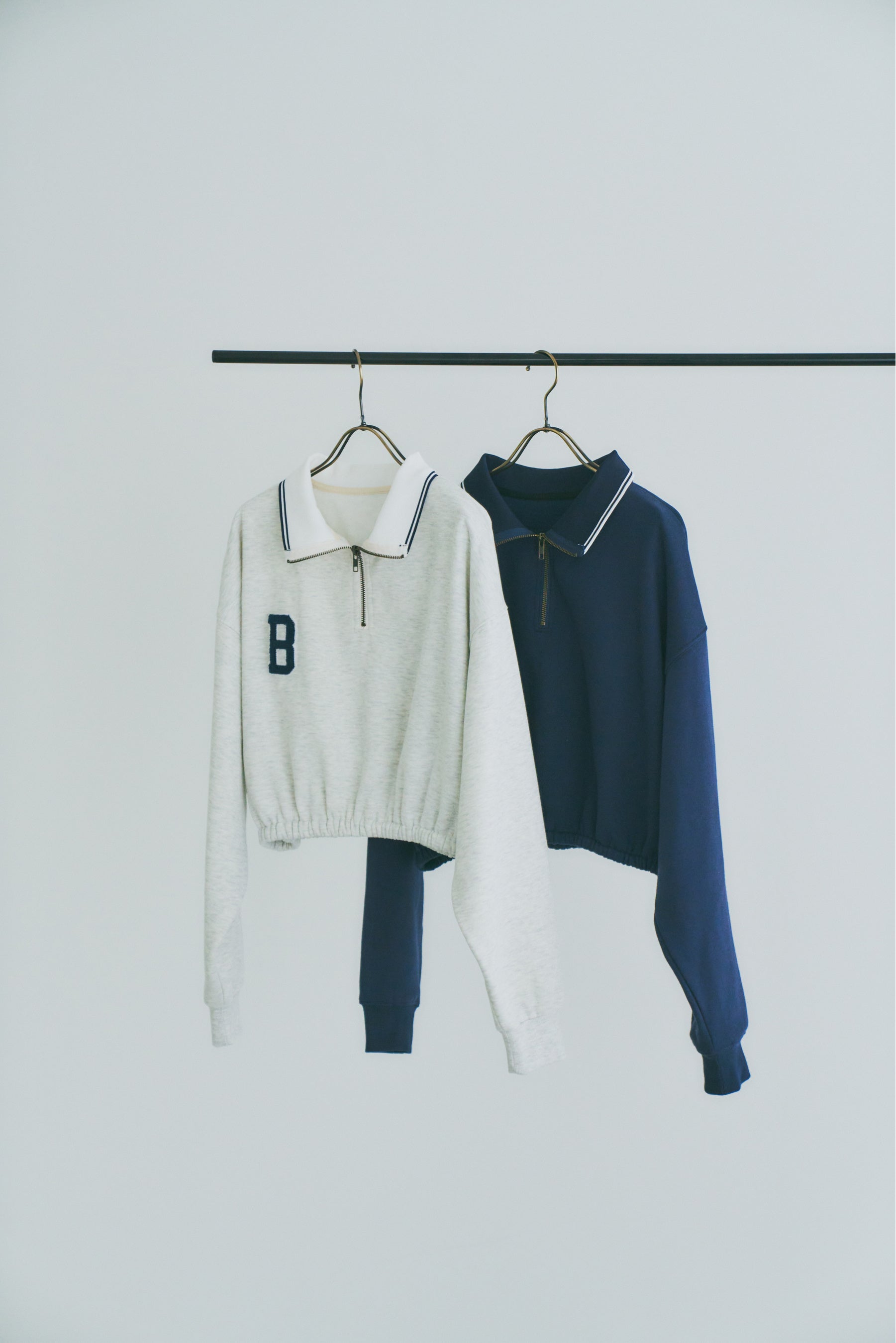 フロントジップのデザインがトレンド感溢れるトップス。胸元にあしらったBマークがアクセントに。