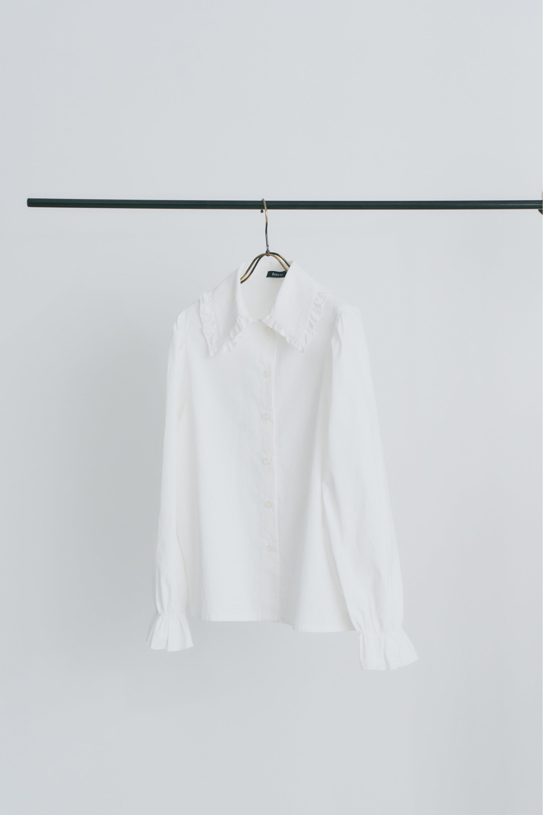 フリルの襟元がガーリーな印象のブラウス。
