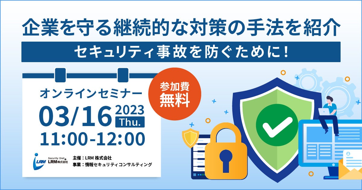 LRM株式会社(以下LRM、本社:兵庫県神戸市、代表取締役CEO 幸松哲也)と株式会社スリーシェイク(以下スリーシェイク、本社:東京都新宿区、代表取締役社長 吉田拓真)は、2023年3月16日(木)11時から、セキュリティ事故を防ぐための企業を守る継続的な対策の手法を学べるオンラインセミナーを無料開催します。Zoomでお気軽にご視聴いただけますので、ぜひご参加ください。