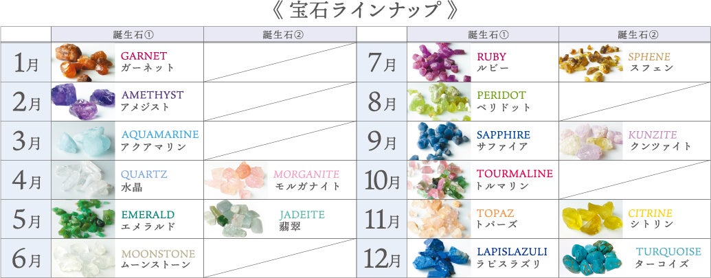 誕生石の種類は12か月分(18種類)あり、全て天然鉱物のため、同じ月の誕生石でも形や模様が異なります。同封のメッセージカードには、誕生石の「石言葉」の説明があり、メッセージを書いて誕生石とともに贈ることができます。