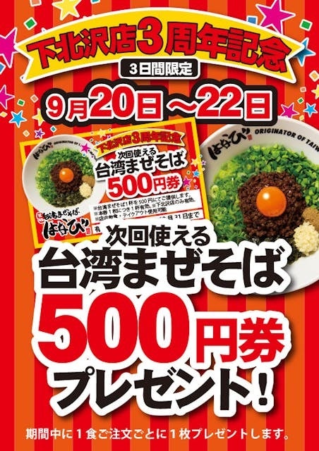 元祖台湾まぜそば 麺屋はなび下北沢店 関東上陸3周年!感謝の気持ちを込めて「次回使える500円券」をプレゼントします!