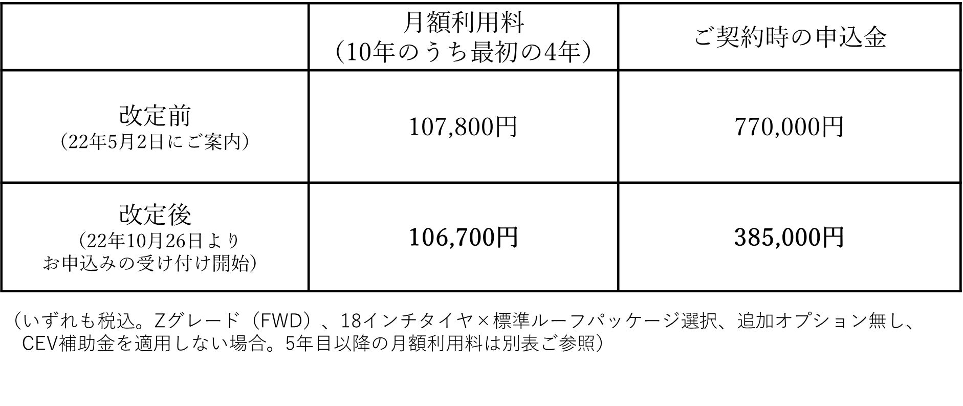また、自動車保険や自動車税、メンテナンス代、車検代などの諸経費、ご契約期間中の電池性能(10年20万km/電池容量70%)の保証、コネクティッドサービスの利用にかかる費用を月額に含める点も、これまでと同様です。
