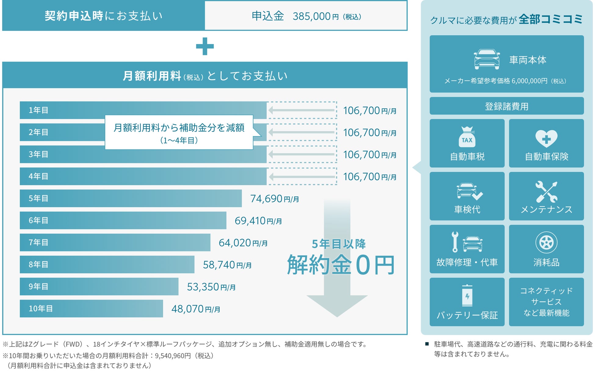 - *⁴ Zグレード(FWD)、18インチタイヤ×標準ルーフパッケージ選択、追加オプション無しの場合。10年間の総支払い額は、CEV補助金を適用しない場合、月額利用料の合計9,540,960円と、ご契約時の申込金385,000円をあわせて、9,925,960円(税込)になります。