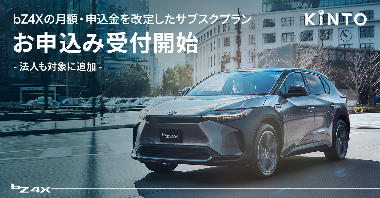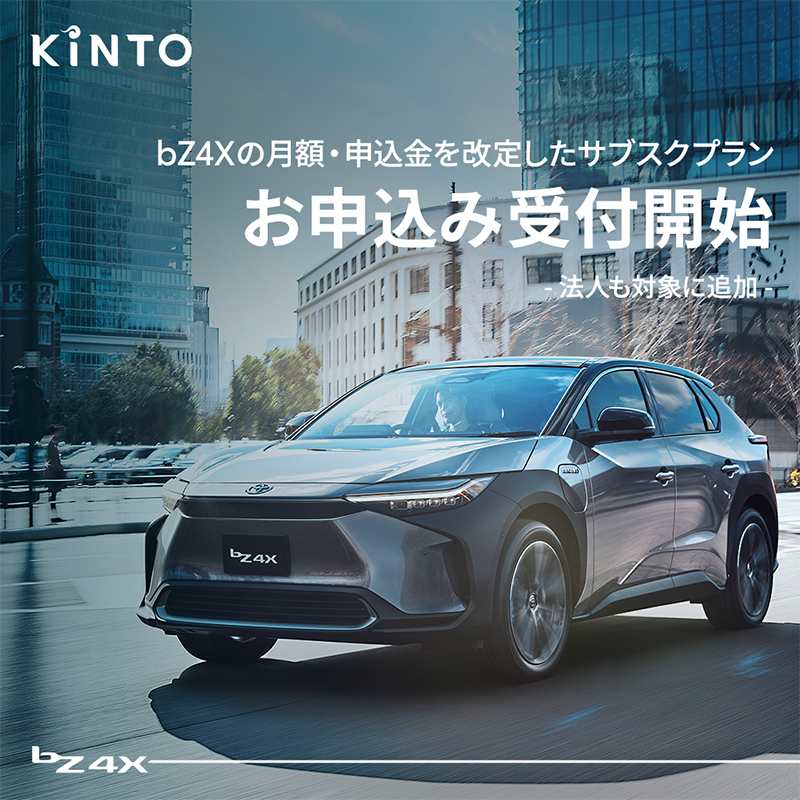 KINTOでは、お客様からこれまでに寄せられたご意見やご要望を踏まえて、5月2日にご案内したbZ4X専用のサブスクリプションプランの月額利用料と、ご契約の際にお支払いいただく申込金をそれぞれ改定し、本日より、新規*³のお申込みの受け付けを始めました。