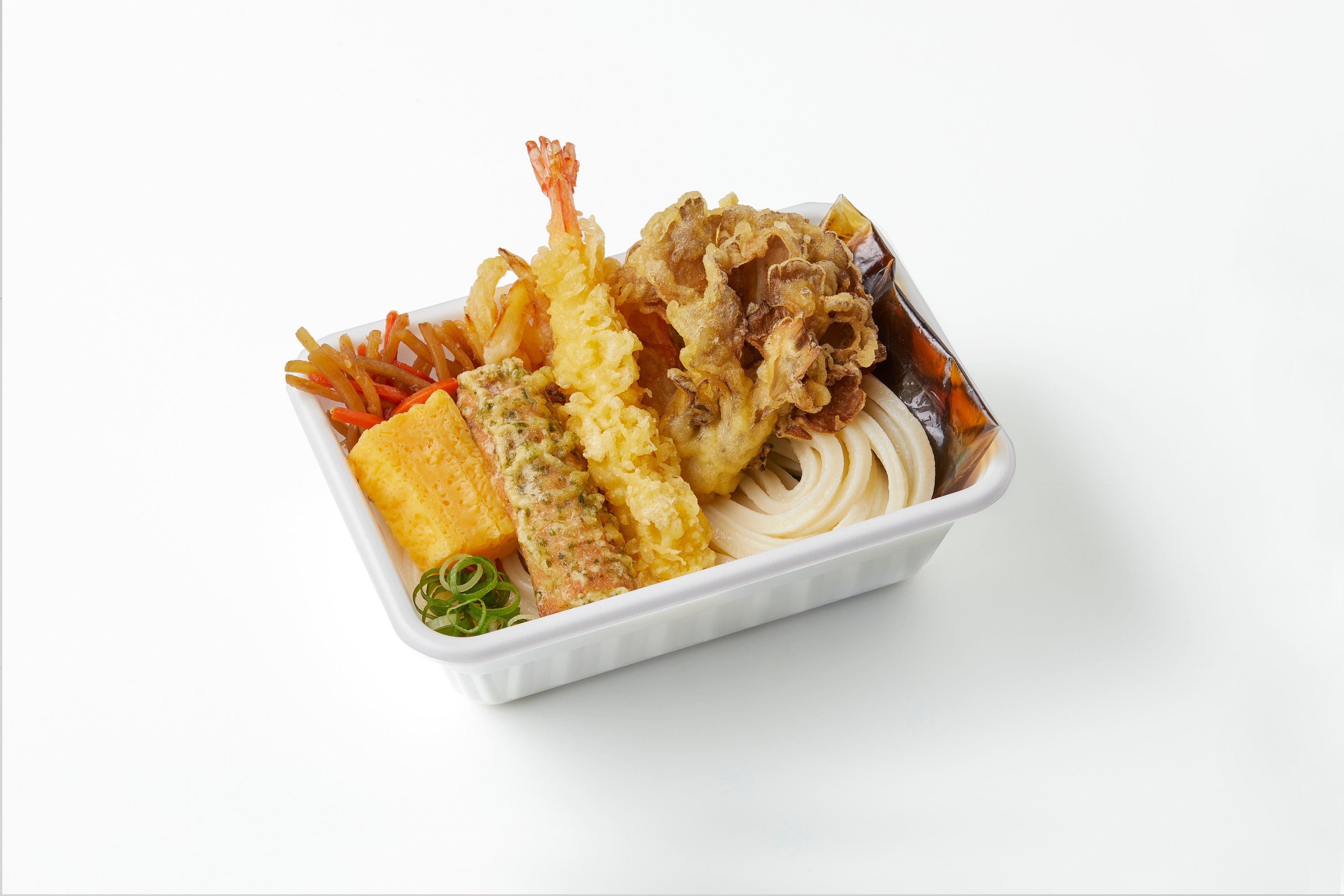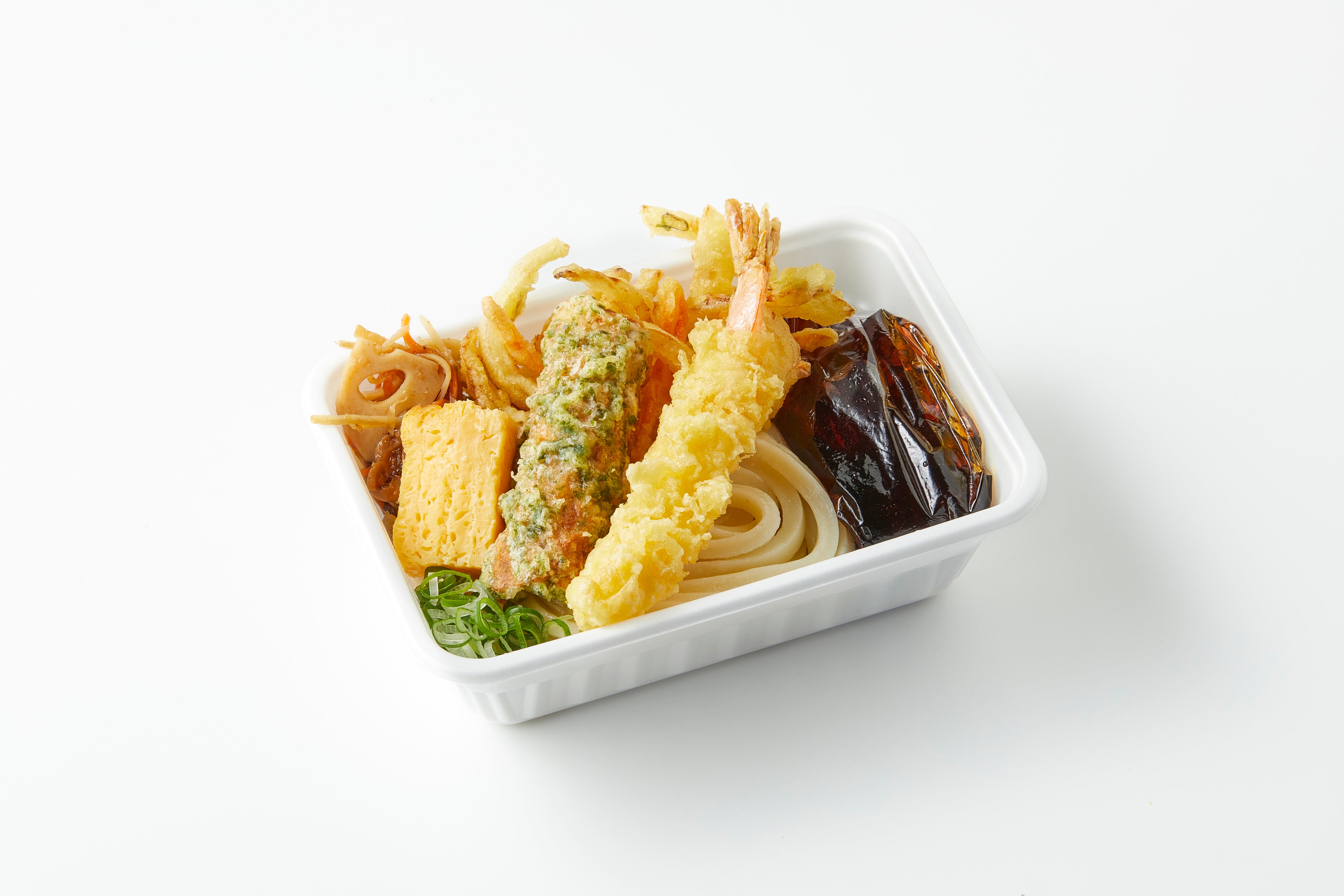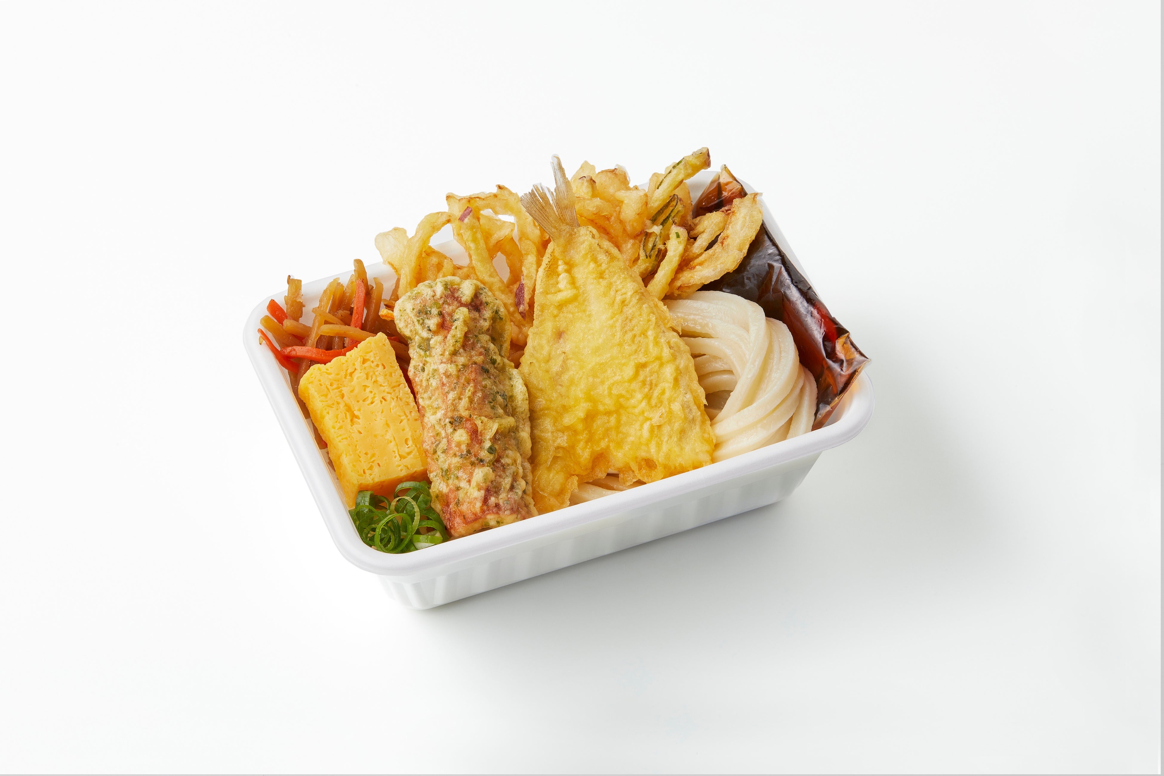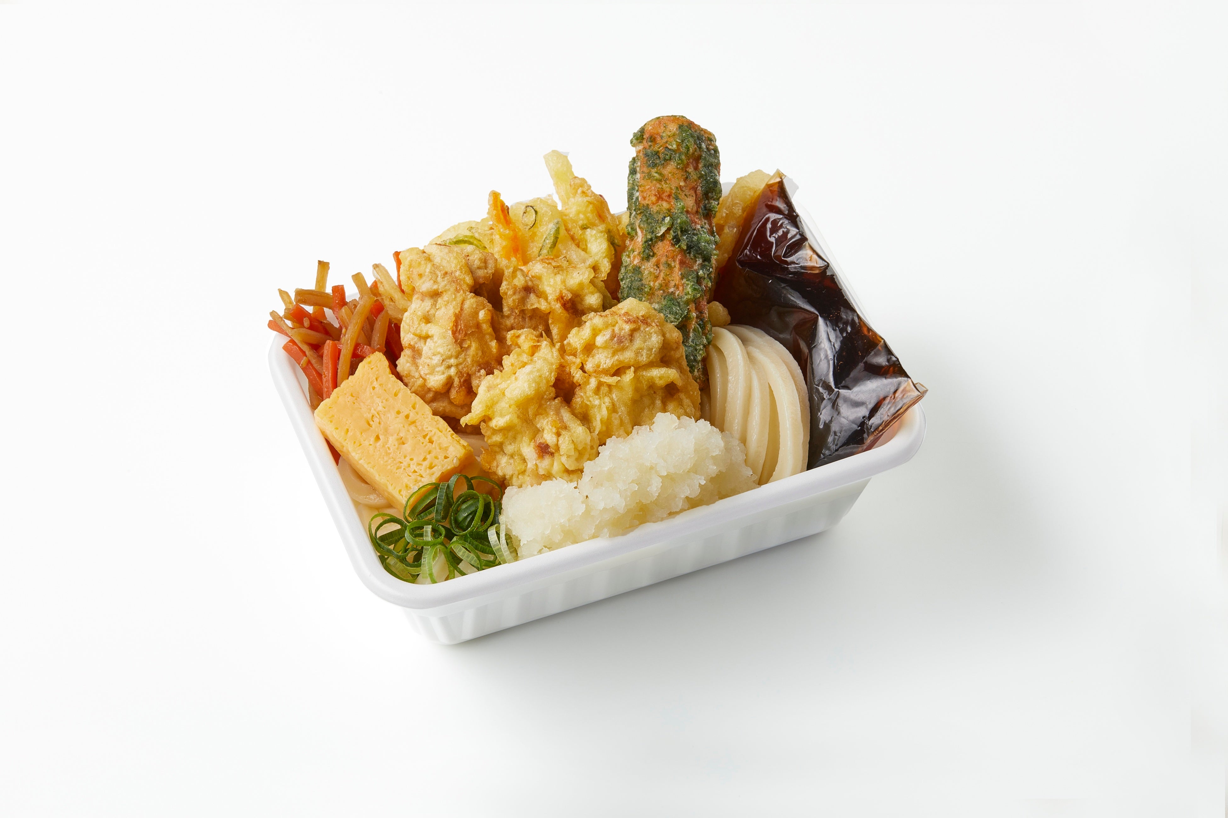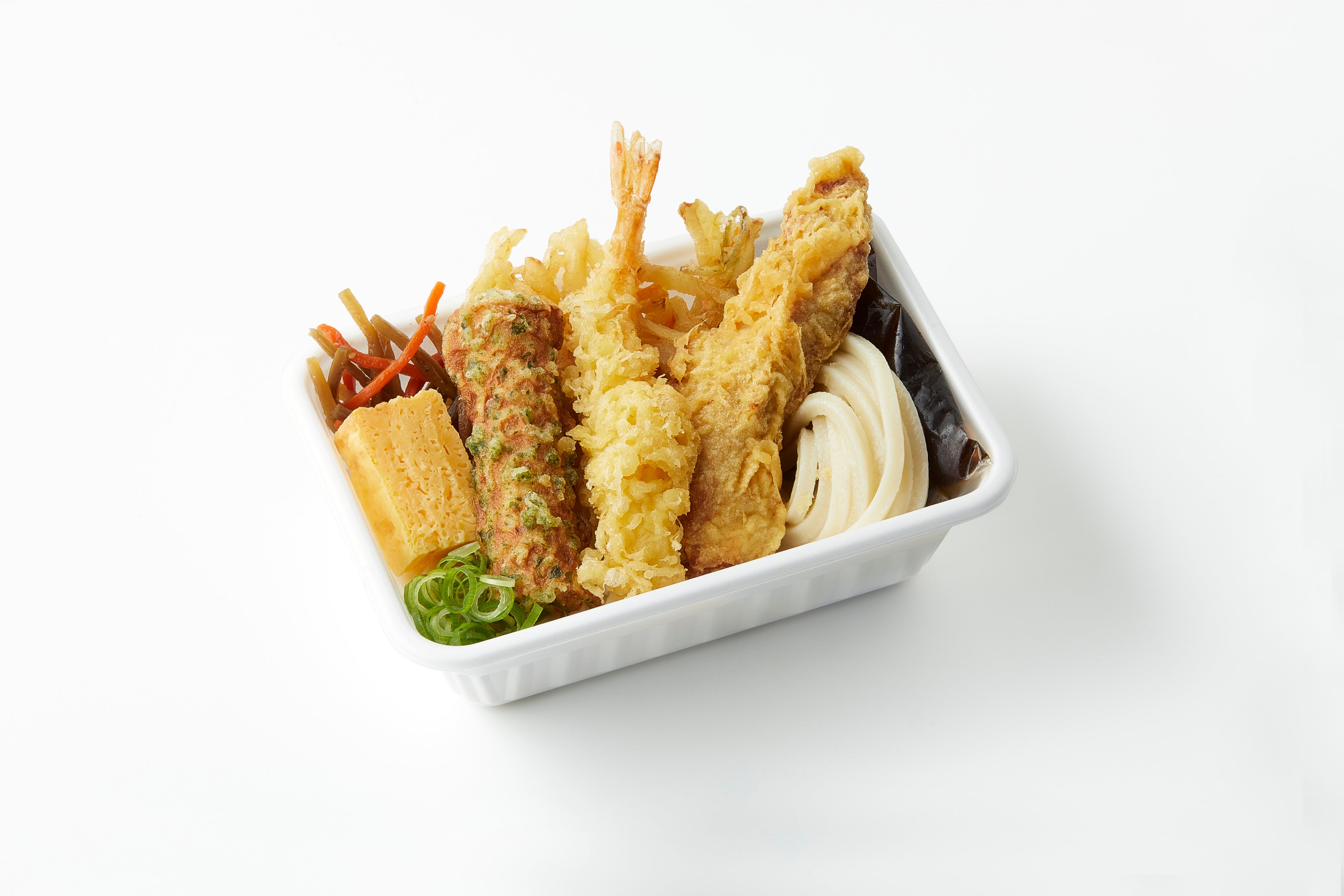 打ち立てうどん、さくさくの天ぷら、おかずをひと箱に!
