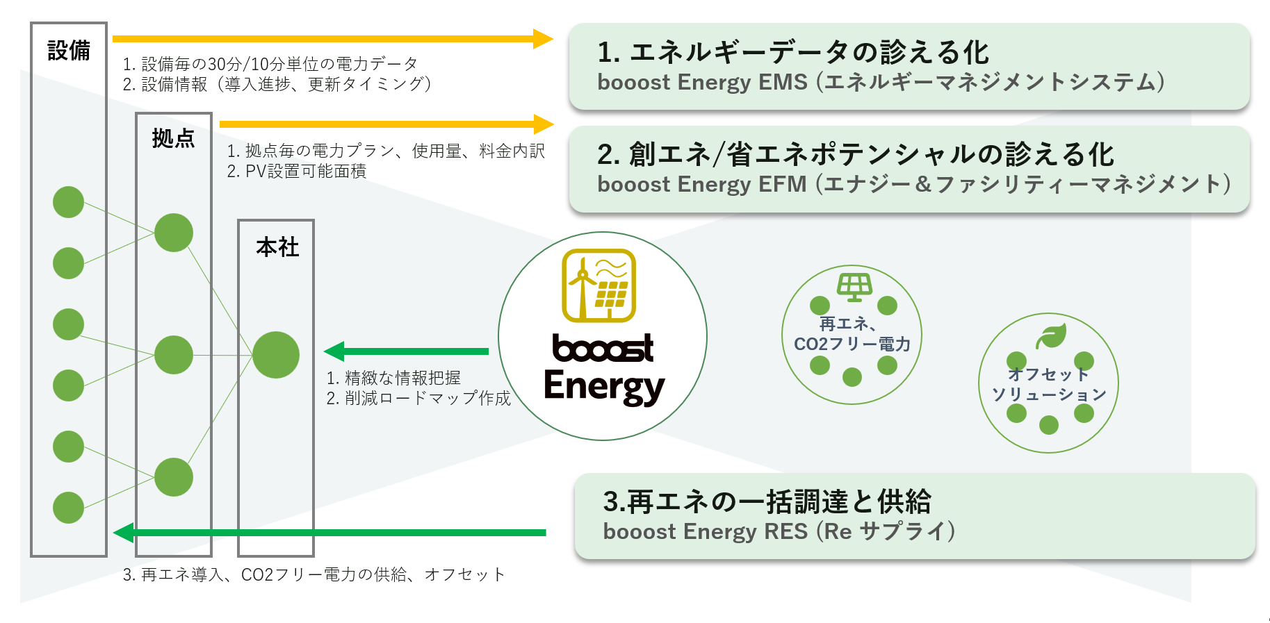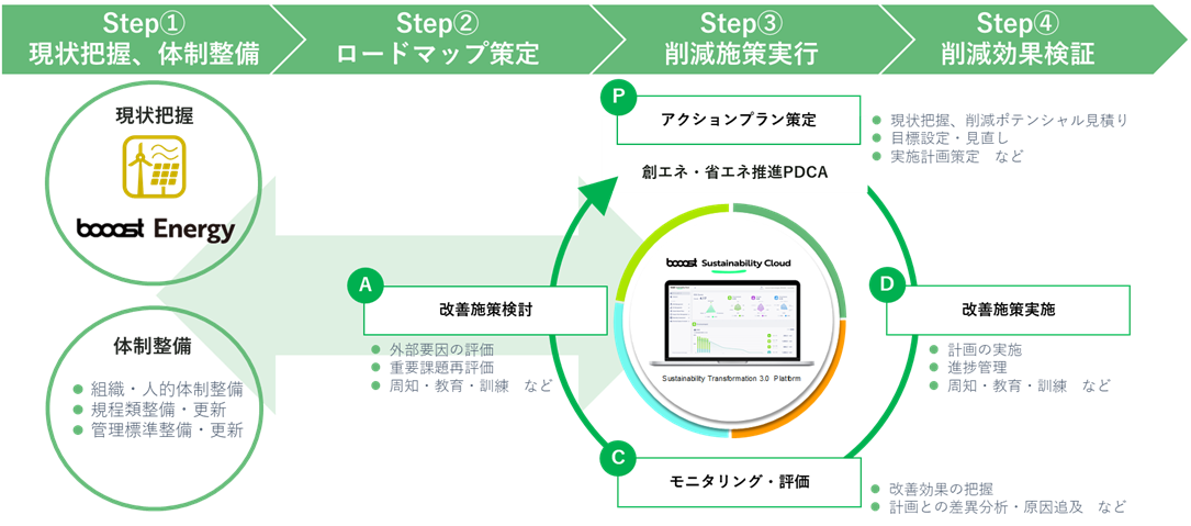当社はこれまでに、イオン株式会社やNTTアノードエナジー株式会社等のエネルギーマネジメント領域の支援実績があり、RE100を推進するグローバルリーダーに選ばれています。「booost Sustainability Cloud」のアプリケーションの一つである、能動的な脱炭素化のためのエネルギーマネジメントを行う「booost Energy」において、その知見やノウハウを活かし、①エネルギーデータの診える化、②省エネ/創エネポテンシャルの診える化、③再エネの一括調達と供給までをワンストップで提供して、企業のScope2削減を実現します。