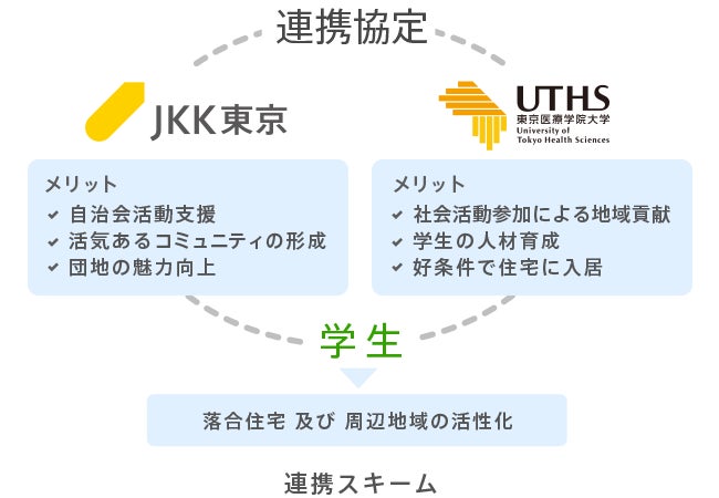 この協定に基づき、常陽学園が運営する「東京医療学院大学」に隣接する多摩ニュータウン落合住宅(東京都多摩市)において、自治会との交流促進など地域活動を行う学生の入居を支援し、地域に根ざした活気あるコミュニティの形成を目指します。