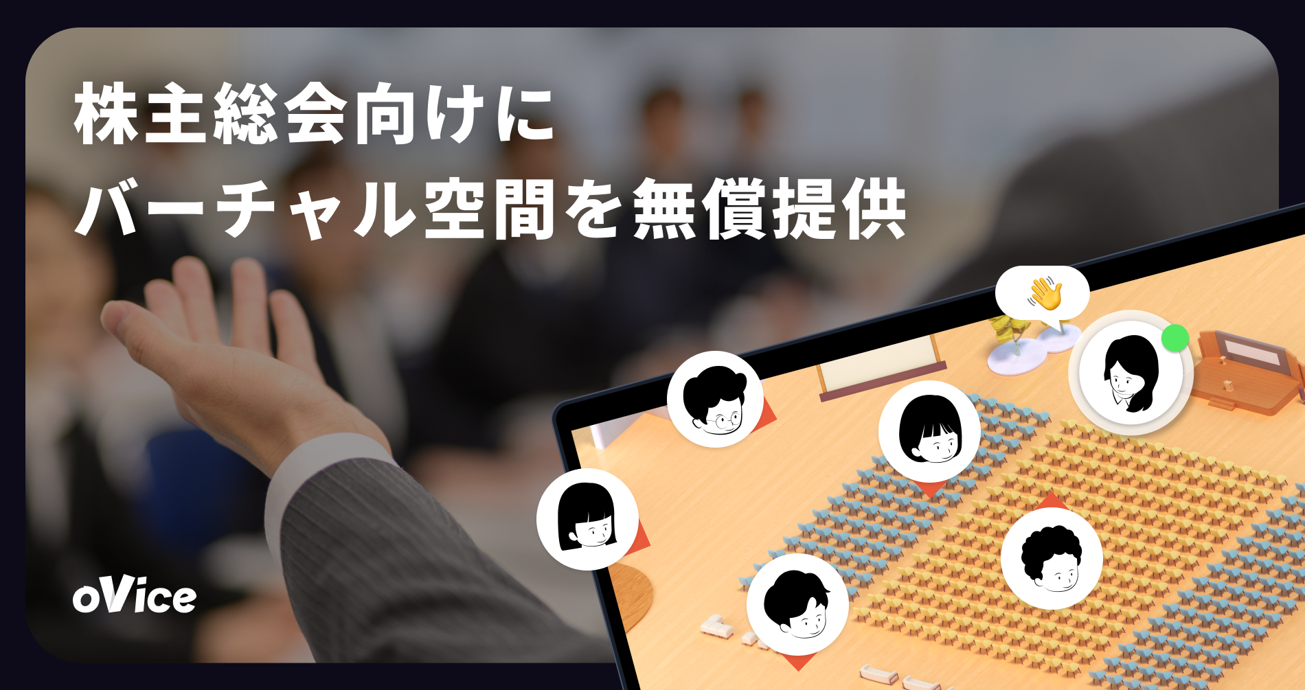 oVice株式会社(本社:石川県七尾市、代表取締役:ジョン・セーヒョン)は、オンラインでの株主総会開催の需要拡大にともない、バーチャル株主総会を開催もしくは検討している企業向けにアバターで自由に交流できるバーチャル空間「oVice(オヴィス)」を、2022年7月31日(日)まで無償提供します。