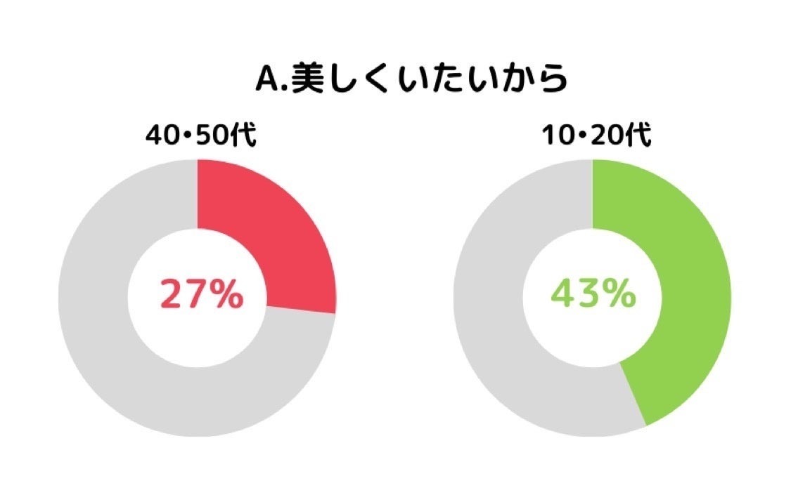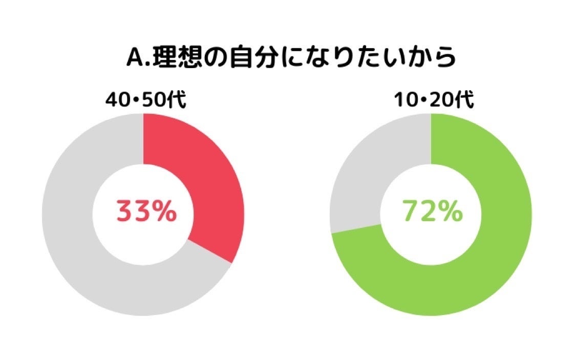 また、10・20代女性の72%がダイエットの理由に「理想の自分になりたいから」を選択しており、この数値は40・50代女性の2倍以上となりました。