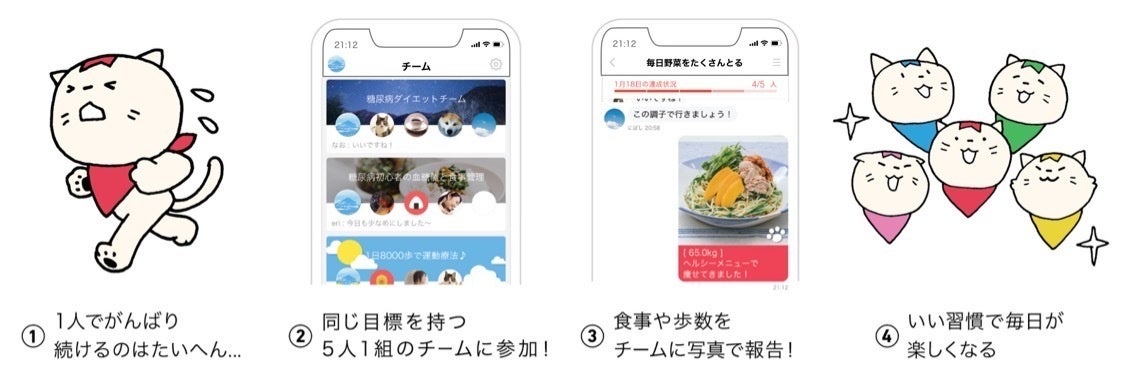 ・毎日自分のチームのチャット画面に頑張った記録を投稿することで、体重や、食事を記録することもできます