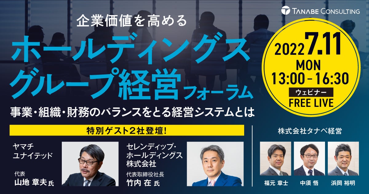本フォーラムでは、特別ゲストとしてヤマチユナイテッド 代表 山地 章夫 氏、セレンディップ・ホールディングス株式会社 代表取締役社長 竹内 在 氏の2名にご登壇いただき、全体ビジョンから事業ポートフォリオの再構築、それらを支えるホールディングス体制構築から運用までを、具体的事例を交えてご紹介いただきます。また、タナベ経営のトップコンサルタントより、10年先を見据えたグループ経営のあり方や、事業を生み出し経営者を育むプラットフォーム型ホールディングス、企業価値向上とサステナビリティを実現するポイントについて提言いたします。