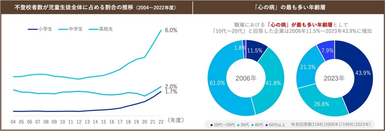 図1 不登校者数の割合推移(左)と「心の病」を抱える年齢別人口割合(右)