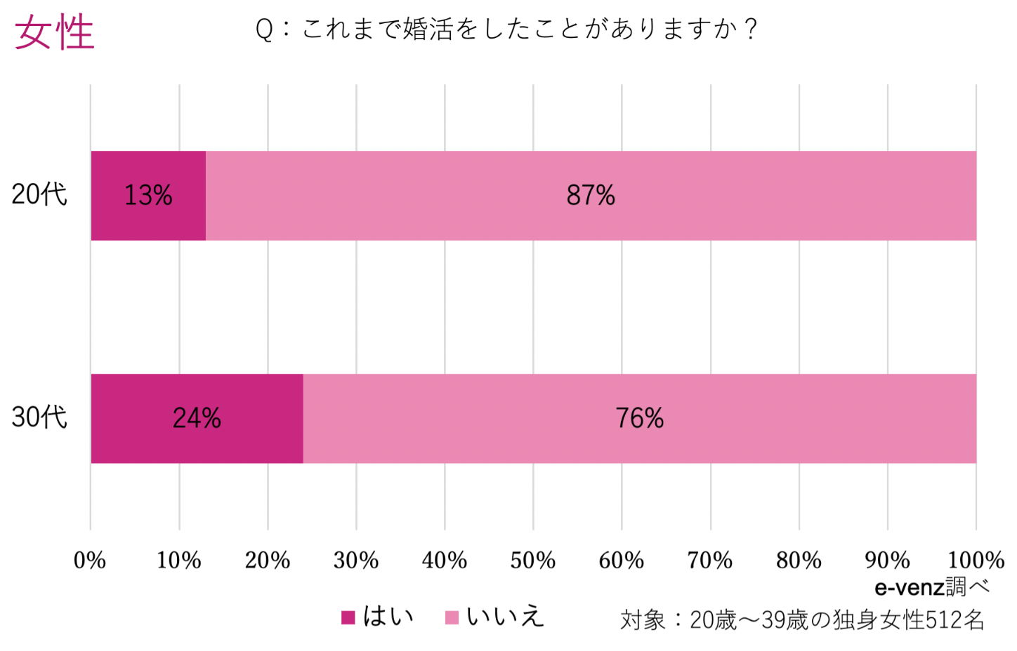 「婚活をしたことがある」と回答した方は、男性が20代15%・30代17%となっており、女性は20代13%・30代24%でした。
