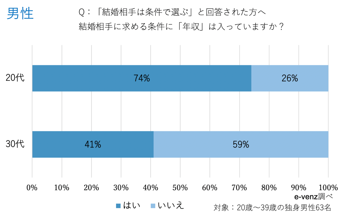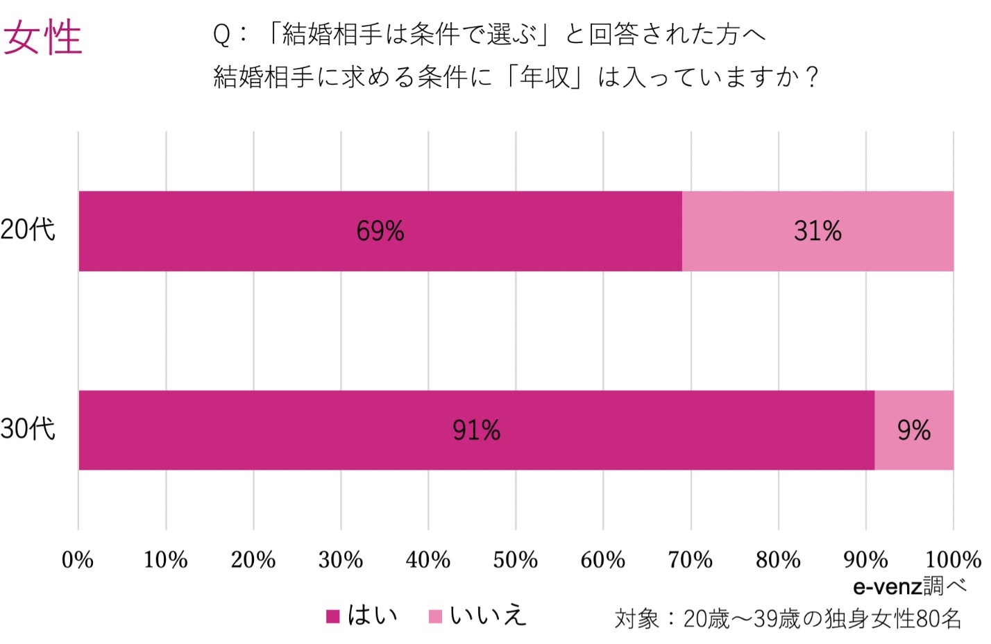「結婚相手は年収で選ぶ」と回答した割合は、一番低かったのが男性30代の41%となっており、最も高い割合が女性30代の91%でした。