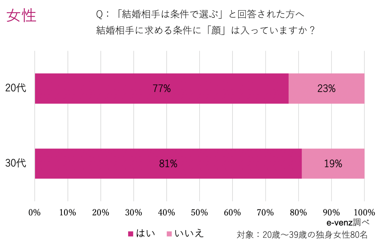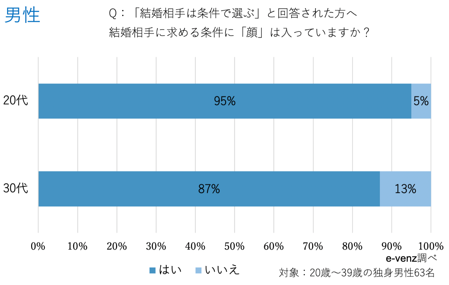 「結婚相手は顔で選ぶ」と回答した方は、男性が20代95%・30代87%となっており、女性は20代77%・30代81%でした。