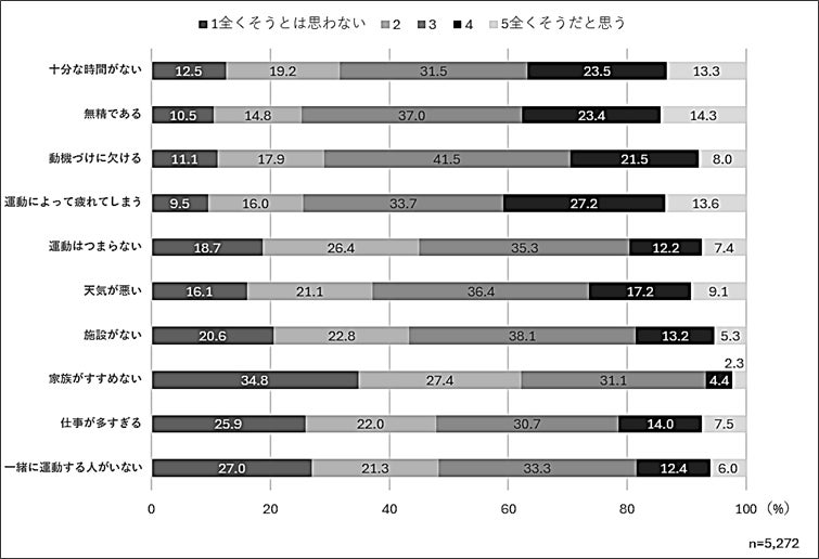 運動阻害要因尺度について項目ごとの回答構成比を示した。5段階中3以上の合計をみると、最も高かったのは「無精である」74.7%、次いで「運動によって疲れてしまう」74.5%であった。続いて「動機づけに欠ける」71.0%、「十分な時間がない」68.3%など怠惰性や時間の管理に関する項目が上位となった。時間的なゆとりの少なさが主な要因ではあるものの、「仕事が多すぎる」は52.2%にとどまっており、仕事以外の理由で時間がとれていない可能性もある。また「一緒に運動する人がいない」「施設がない」といった社会的あるいは物理的な環境要因に占める割合は相対的に低かった。