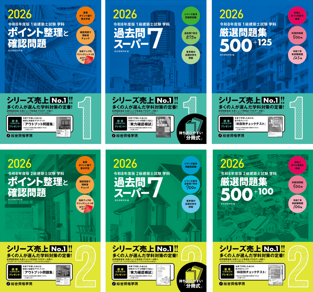 建設・不動産関連の資格取得スクール「総合資格学院」を運営する株式会社総合資格(本社:東京都新宿区、代表取締役:佐藤 拓也)は、シリーズ売上ナンバーワン(※)を誇る「建築士学科問題集シリーズ」の令和8年度版(2026年度版)として、『ポイント整理と確認問題』『過去問スーパー7』『厳選問題集』の3種類の問題集を1級建築士用、2級建築士用ともに、令和7年11月下旬~12月中旬にかけて順次、発売開始します。