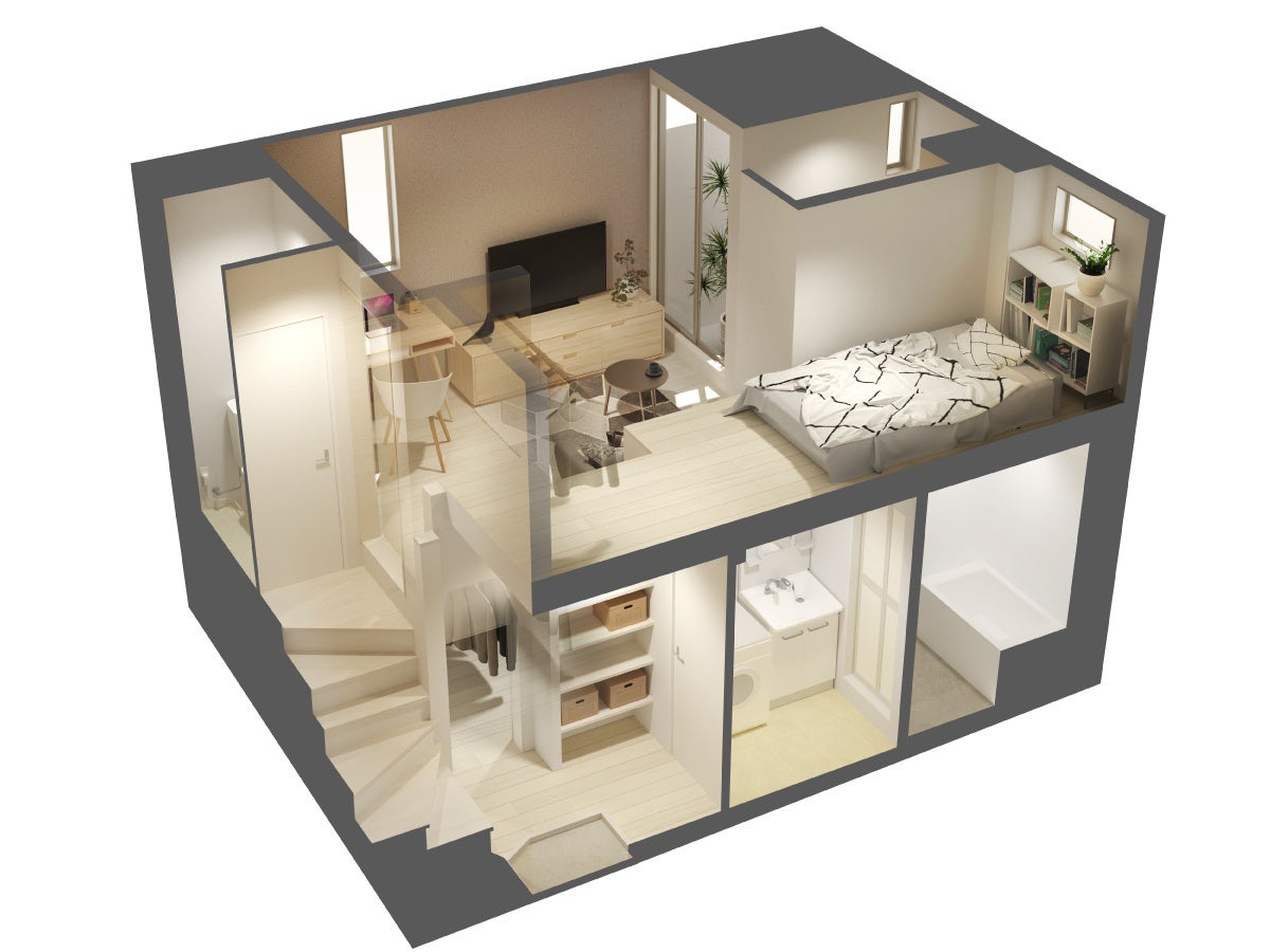 5万人の入居者とオーナーの要望を具体化した当物件は、独自の複層構造(スキップフロア)により床下クロークと高さ約140cmのロフトスペースを確保。これにより単身アパートが抱える収納の問題を解消し、木造のテーマである上下間の音の問題も緩和。空間を最大限に活用することで1Kのお部屋がまるで1LDKのお部屋かのような、居住空間にゆとりを提供します。