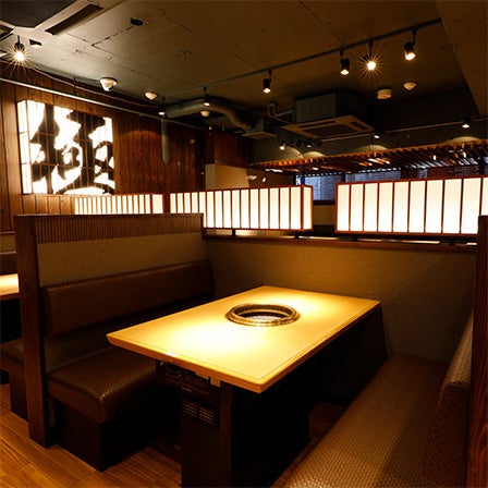 より落ち着いた雰囲気で和牛焼肉をお楽しみいただけるよう、カウンターをボックスタイプの席に全面改装。店内はダウン照明を活用し、暗めの壁紙でシックなデザインの設計に。
