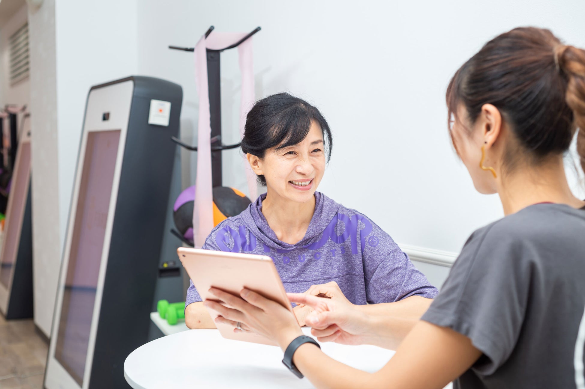一度作成したプログラムは、2ヵ月に1回のペースでトレーナーと定期カウンセリングを実施し、負荷や強度が合っているか等を確認しながら、少しずつレベルアップいたします。「膝が痛い」「怪我をした」などの場合でも、部位に負担がかからないメニューに変更をかけますのでご安心ください。目的や悩みの変更にあわせた内容に調整できますので、マンネリ化せず、飽きずにトレーニングが続けられます。カウンセリング時には、体組成計で、 脂肪量・筋肉量・水分量等を計測させていただきます。定期的な変化を感じていただくことが、ご自身のモチベーションアップにもつながり、結果にもつながります。