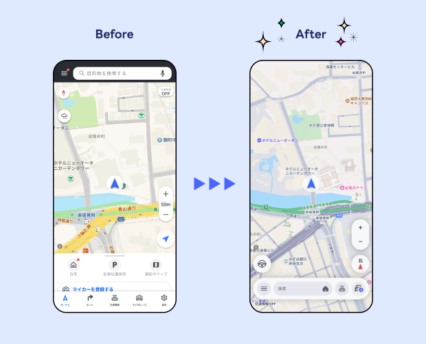 地図デザインのアップデートでは、道路がより見やすくなるよう色合いが調整されます。マップボックス社の技術を活かし、地図のカラーリングやフォントを柔軟にカスタマイズすることで、ブランドデザインを維持しながら視認性の高い地図を提供します。また、新たに導入される3D表示機能により、ランドマークを立体的に表示し、現実に近い視覚情報を提供することで、よりスムーズな運転に役立ちます。
