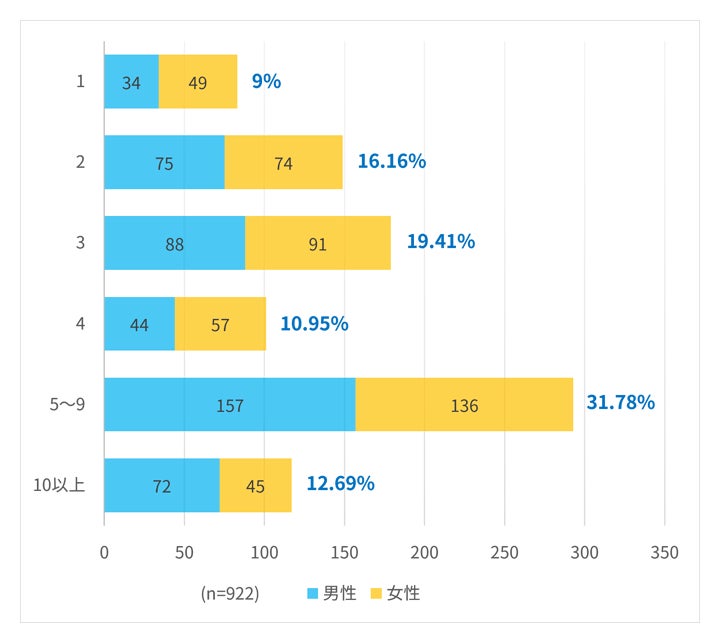 利用するポイントサイトは複数が主流、という結果になりました。最も多かったのは「5~9個利用」という回答で、全体の31.78%を占めました。次いで「3個利用(19.41%)」や「2個利用(16.16%)」が続き、複数のポイントサイトを使い分けている人が多いことがわかりました。一方で、「1個のみ」という回答は9%にとどまり、少数派でした。また、「10個以上利用」というヘビーユーザーも全体の12.69%と一定数存在し、男女ともに利用の幅が広がっていることが特徴的です。これらの結果から、多くの人がポイントサイトを組み合わせ、目的にあわせてより効率的に「ポイ活」を楽しんでいることがうかがえます。