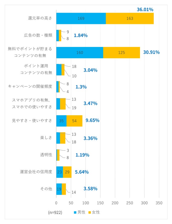 最も多い回答は「還元率の高さ」で、全体の36.01%が選びました。男女問わず、より効率的にポイントを貯められるサイトが支持されていることがわかります。次いで多かったのは「無料でポイントが貯まるコンテンツの有無(30.91%)」で、特に男性にやや高い支持が見られました。その他には、「見やすさ・使いやすさ(9.65%)」や「運営会社の信用度(5.64%)」も選ばれ、信頼性や利便性も一定の重視ポイントとなっているようです。一方で、「広告の数・種類(1.84%)」や「キャンペーンの開催頻度(1.30%)」を重視する人は少数派でした。この結果から、多くのユーザーが還元率やコストパフォーマンスを最優先に考えていることがうかがえます。