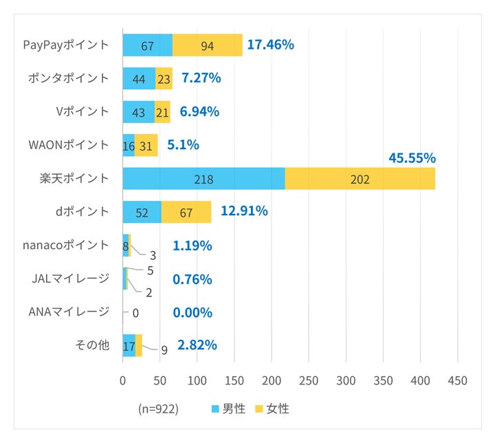 楽天ポイントが全体の45.55%でトップとなりました。次いで、PayPayポイント(17.46%)、dポイント(12.91%)が上位にランクインしています。特に楽天ポイントは、男女ともに高い支持を集めており、日常生活のさまざまな場面で利用されていることがうかがえます。一方で、「nanacoポイント(1.19%)」や「JALマイレージ(0.76%)」の利用者は少なく、航空系マイレージに関しては、ANAマイレージの回答が0%という結果となりました。この結果から、日常的な買い物やオンラインショッピングで使いやすいポイントが、多くの人に選ばれていることが明らかになりました。