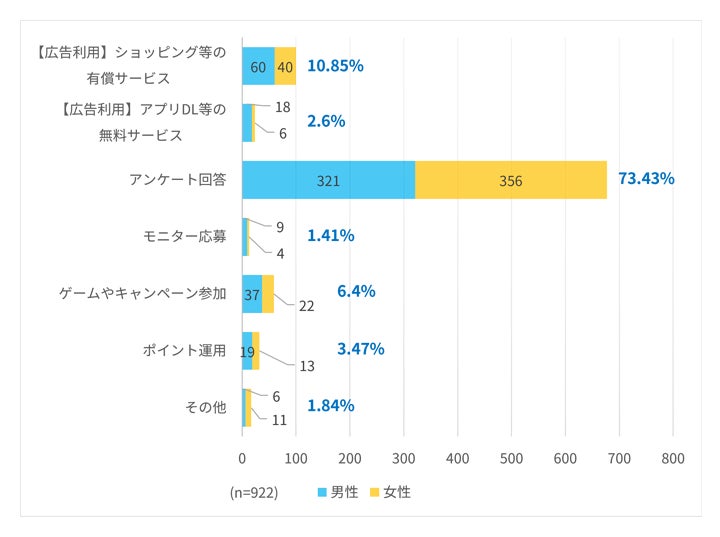 圧倒的に多いのは「アンケート回答」で、全体の73.43%を占めました。男女問わず多くの人が、手軽に取り組める方法としてアンケート回答を活用しているようです。次いで多かったのは「広告利用:ショッピングなどの有償サービス(10.85%)」、その後に「ゲームやキャンペーン参加(6.40%)」が続きました。一方で、「アプリダウンロードなどの無料サービス」や「モニター応募」「ポイント運用」などの利用頻度は比較的低めという結果でした。この結果から、多くのユーザーが「コストをかけず、気軽にできる方法」を重視していることがうかがえます。
