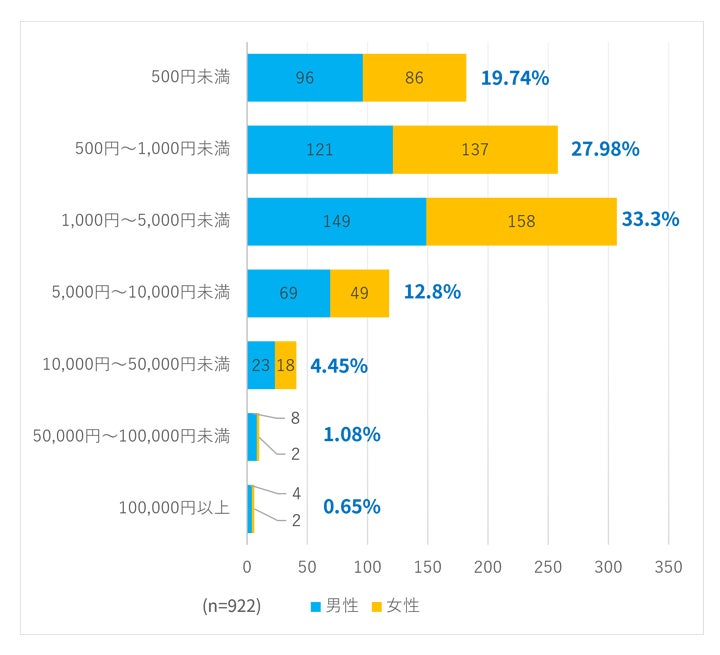 1か月で1,000円以上貯める人が過半数を占める結果となりました。「1,000円~5,000円未満」が最も多く、全体の33.30%。次いで、「500円~1,000円未満(27.98%)」、「500円未満(19.74%)」が続き、1,000円未満の人も全体の約半数を占める結果となりました。一方で、「5,000円~10,000円未満」を貯める人は12.80%、さらに「10,000円以上」を貯める人も少数ながら存在しており、特に男性では高額ポイントを貯めている人の割合がやや高い傾向が見られました。この結果から、多くの人が「日常のちょっとしたお得」を目標にポイ活を続けている一方で、一部の人は大きな還元を狙って積極的に取り組んでいることがわかります。