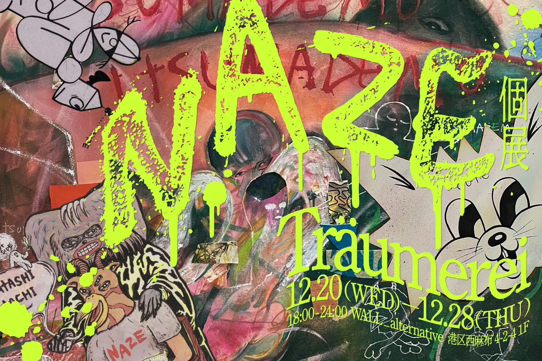 NAZEは、グラフィティカルチャーをベースに、触覚的な筆致で描かれるドローイングやスプレー、廃棄物を用いたコラージュなど多彩な表現でストリートやファッションシーンから現代アートの領域まで幅広く活動を展開するアーティストです。展示タイトルは国道246号沿いで作家が偶然拾ったキャンバスに描かれていたロベルト・シューマンの楽曲「Träumerei」から来ており、ドイツ語で夢見心地、夢を見るという意味を含んでいます。これまで夢や幻想を描き、また、絵を描く中で偶然を受け入れ制作することを大切にしてきたNAZEの作家性を表すタイトルとなっています。