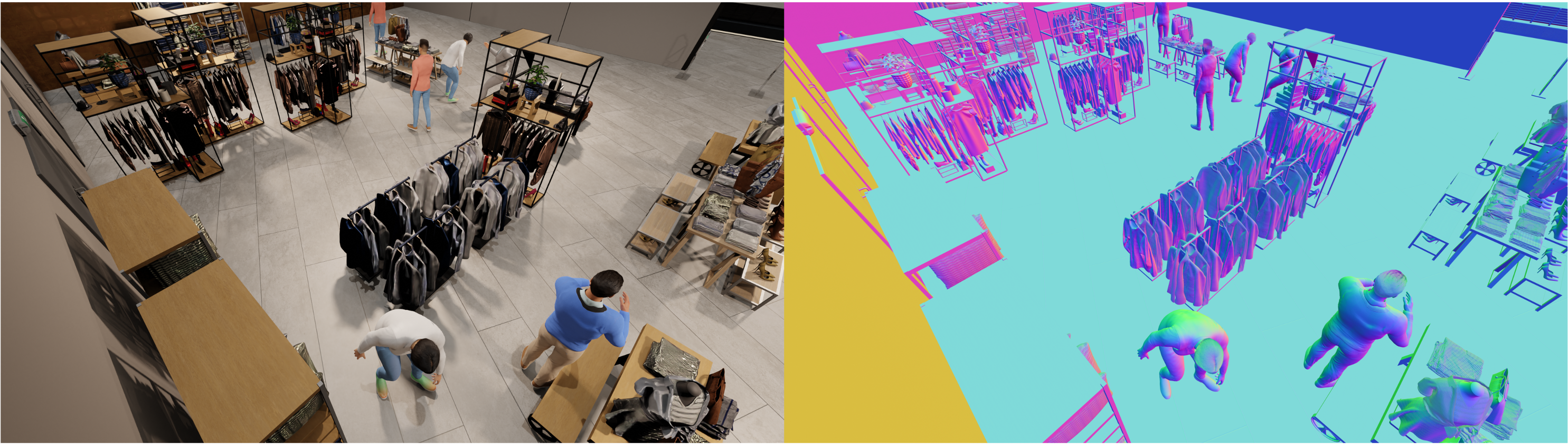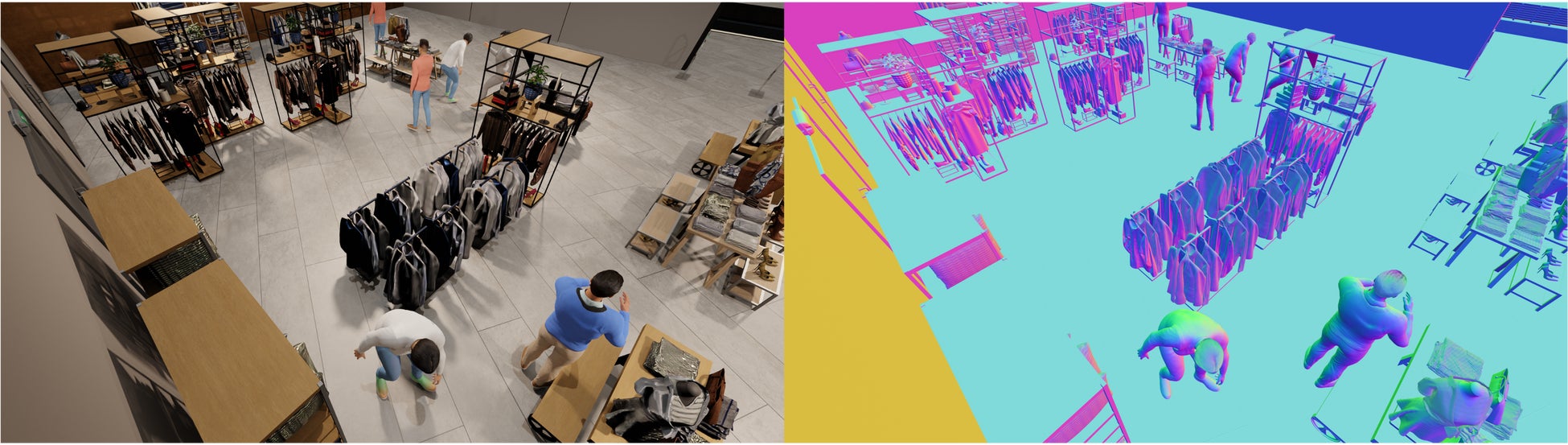 監視カメラからの俯瞰画像を用いた人物検出モデルの開発に際して、実際の監視カメラ映像が大量に必要でしたが、個人情報保護などの制約が存在しており、十分な量の高品質な教師データを得ることが困難という課題が存在しています。3DCGを活用することにより、監視カメラからの俯瞰画像と人物検出用の教師データを同時に自動生成し、現実環境に近いデータセットの構築。本データセットを活用することにより、人物検出モデルの精度を約20%向上することを実現しています。