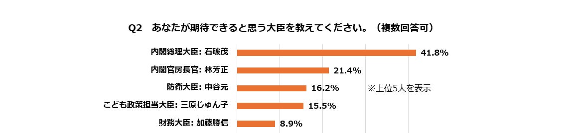 期待できると思う大臣を複数回答で聞くと、上位は石破茂首相41.8%、林芳正官房長官21.4%、中谷元・防衛相16.2%の順。期待できると思う自民党役員を同じように聞くと、上位は石破総裁37.9%、菅義偉副総裁26.9%、小泉進次郎選対委員長16.9%の順となった。