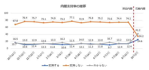 石破内閣を支持24%、不支持34%、わからない41%