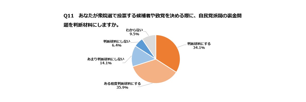 衆院選で投票先を決める際に自民党派閥の裏金問題を判断材料にするかどうかを聞くと「ある程度判断材料にする」35.9%、「判断材料にする」34.1%(合計70.0%)、「あまり判断材料にしない」14.1%、「判断材料にしない」6.4%(合計20.5%)となった。