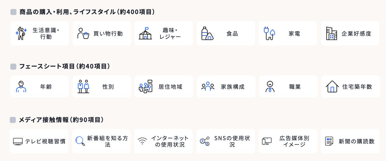【聴取項目の幅広さ】 年齢・性別や家族構成などのフェイスシート項目、購買行動や趣味・レジャーなどのライフスタイル項目、 テレビやSNSなどのメディア接触項目など、調査項目は約530項目となります。生活に関して多種多様な側 面の把握が可能です。