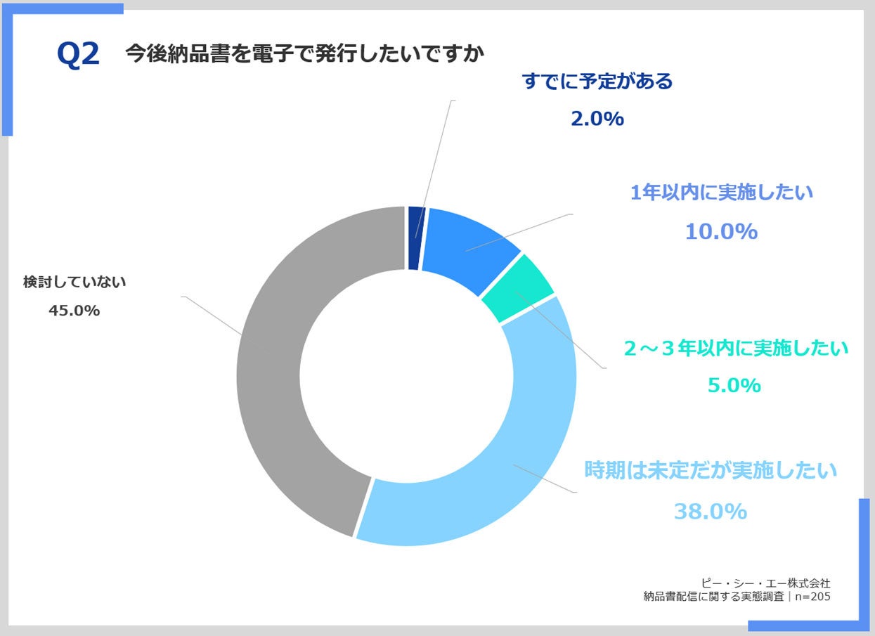 納品書をまだ電子で配信していないと回答した企業に対して「Q2. 今後納品書を電子で発行したいですか」(n=205)と質問したところ、「すでに予定がある」が2%、「1年以内に実施したい」が10%、「2~3年以内に実施したい」が5%、「時期は未定だが実施したい」が38%などという回答となりました。