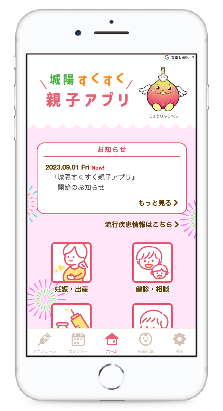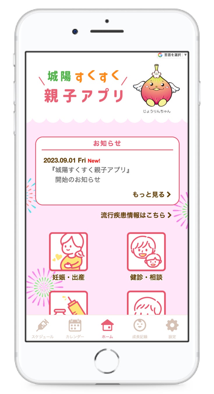 「城陽市の子どもたちにすくすく育ってほしい」という想いを込めて「城陽すくすく親子アプリ」と命名しました。トップページには、城陽市イメージキャラクター「じょうりんちゃん」が登場しています。