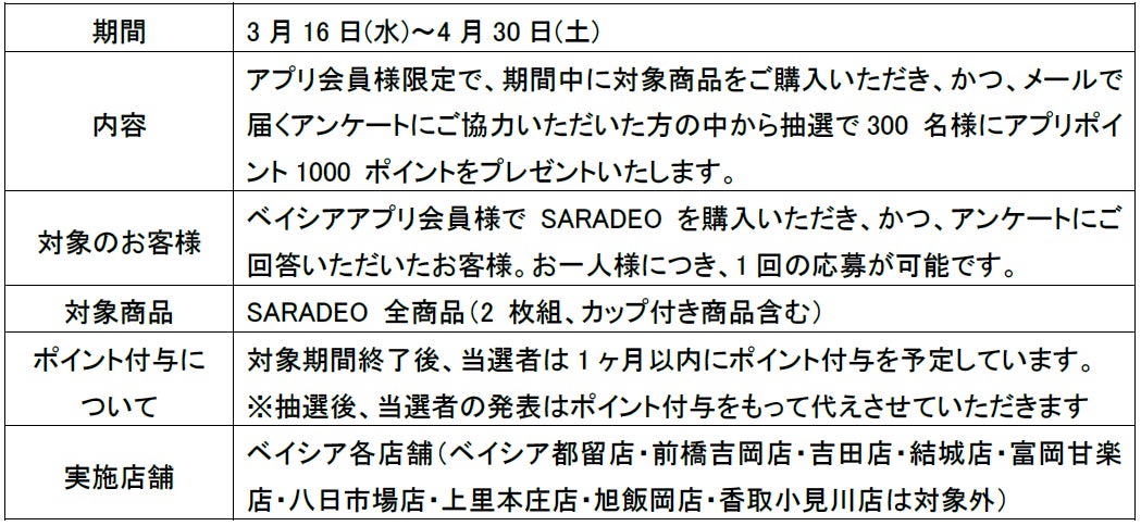 株式会社ベイシア(本社:群馬県前橋市、代表取締役社長:橋本浩英)は、新素材にリニューアルした春夏シーズンインナー「SARADEO(サラデオ)」を、3月16日(水)より衣料品取り扱い店舗87店舗※にて販売開始いたします。