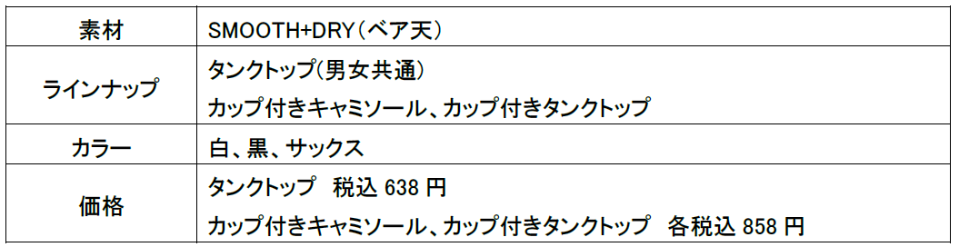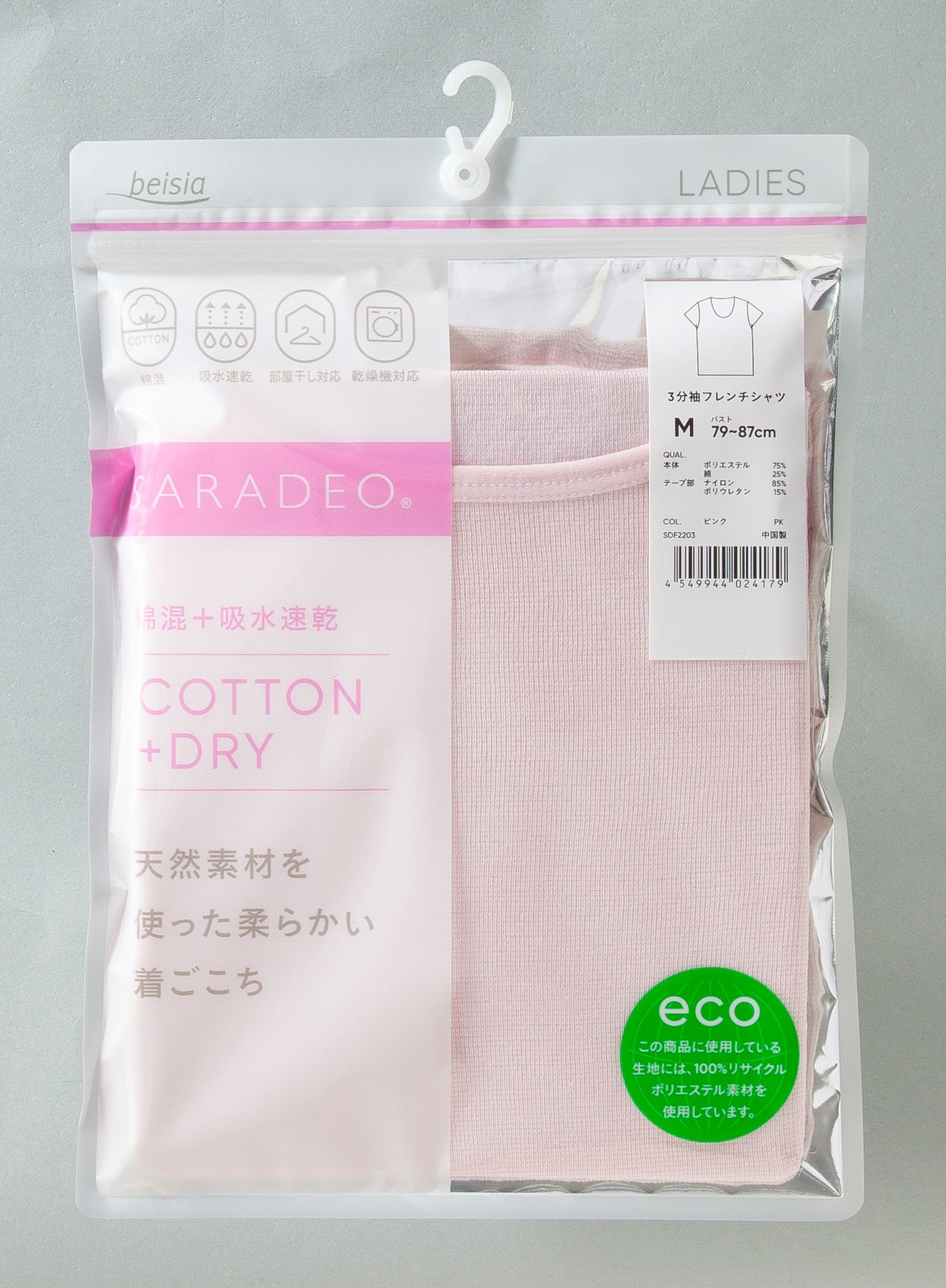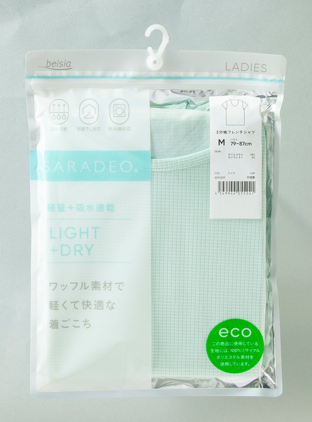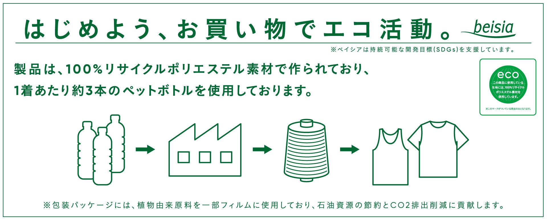 2022 年春夏シーズンインナーでは、生地に使用するポリエステルにはリサイクル100 %素材を使用しています。製品1着につき、ペットボトル3本を使用して商品化しています。包装パッケージには、植物由来の原料を一部フィルムに使用し、石油資源の節約とCO2排出削減に取り組んでいます。本商品を通して地球環境保護に寄与する取り組みの一つとなっています。