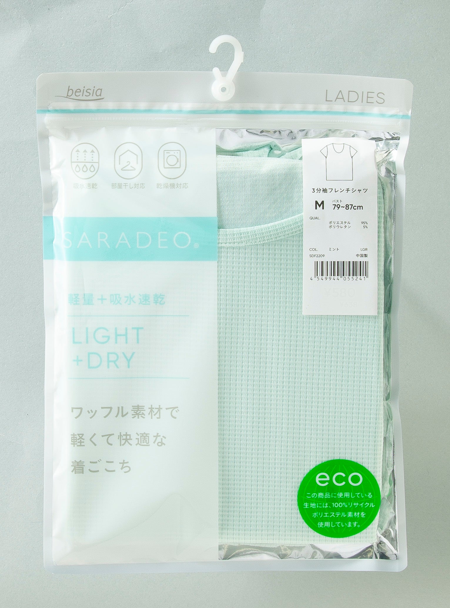 春、夏向けに販売している「SARADEO」が、今年は生地に使用しているポリエステル素材が100%リサイクル素材に生まれ変わりました。普段購入している商品で機能性や価格を変えることなく、エコ活動を実現する商品です。何か特別なことをしたり、今までの生活スタイルを変えることなく、身近なところから環境への取り組みを実践できます。「SARADEO」を選ぶことが、「環境にとって実は少し良いことをしている」ということをお客様に共感いただき、商品を手に取っていただきたいと思います。