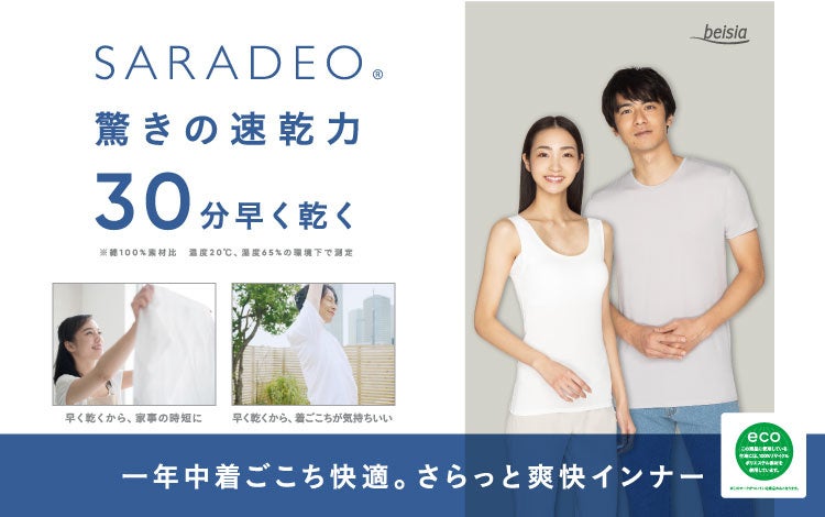株式会社ベイシア(本社:群馬県前橋市、代表取締役社長:橋本浩英)は、新素材にリニューアルした春夏シーズンインナー「SARADEO(サラデオ)」を、3月16日(水)より衣料品取り扱い店舗87店舗※にて販売開始いたします。同商品は、吸水速乾、部屋干し対応、乾燥機対応の機能を携え、着心地の快適さや家事のしやすさを追求して開発したインナーです。さらに、新素材の生地には100%リサイクルポリエステル素材を使用し、地球環境に配慮した商品です。発売から4月末まで、商品をお買い上げいただいたベイシアアプリ会員様対象のキャンペーンも実施いたします。さらっと快適な着心地の「SARADEO」をぜひお試ください。