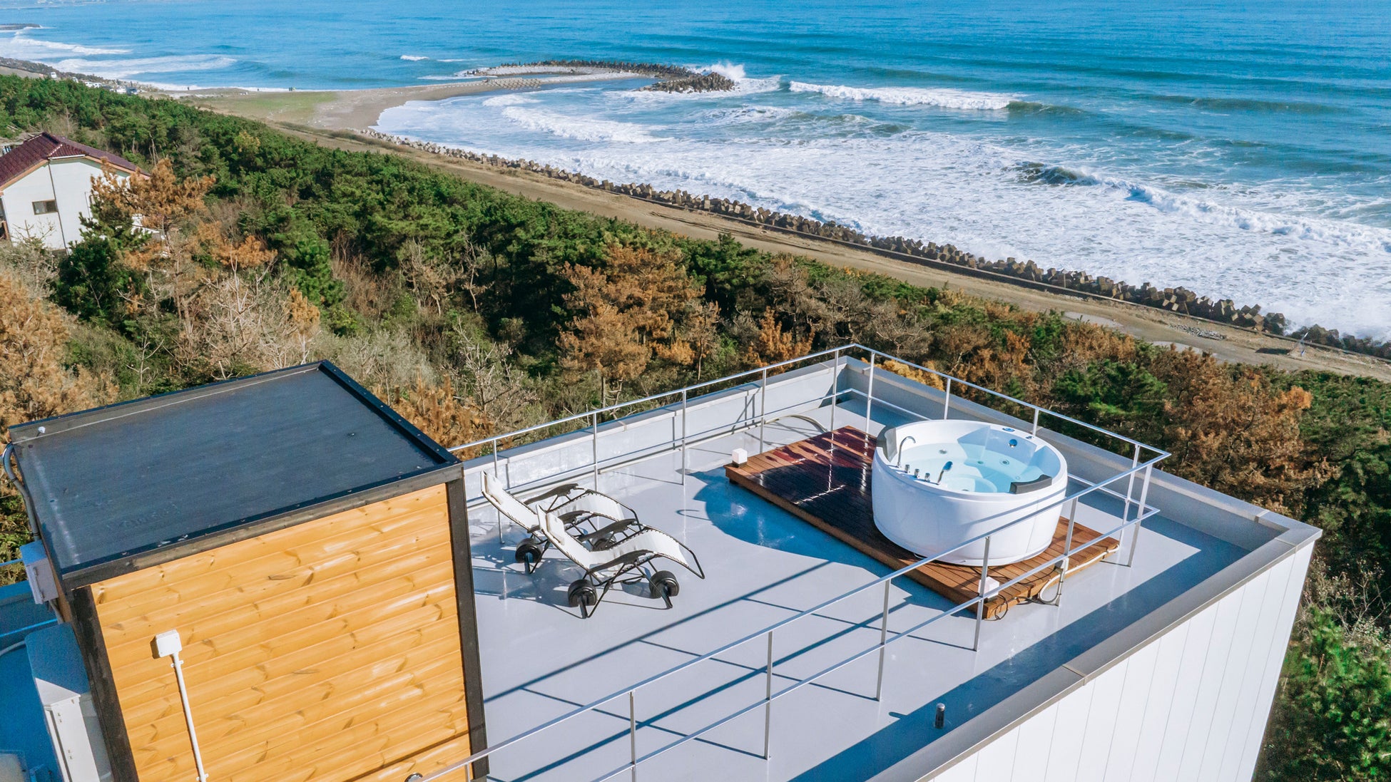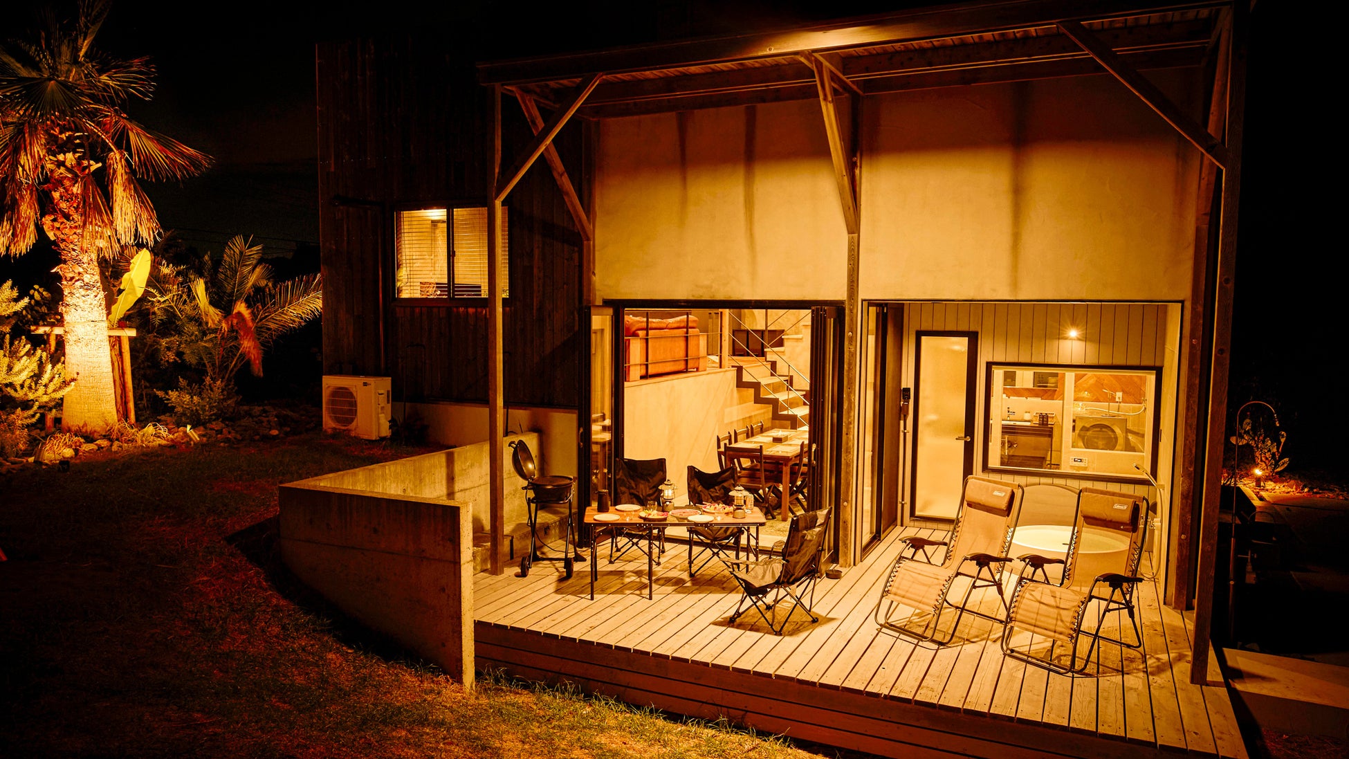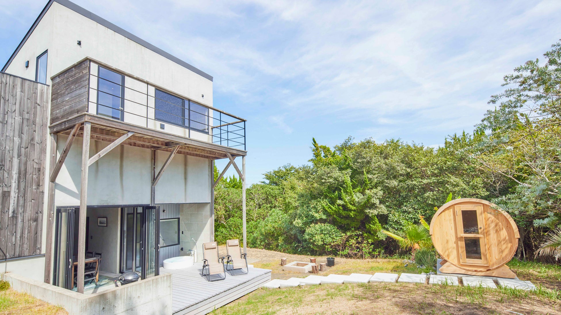 海からの風が吹き抜ける庭にはウッドデッキと焚き火スペースを備え、サウナやキャンプ体験など、自然とともに過ごす時間を満喫できます。