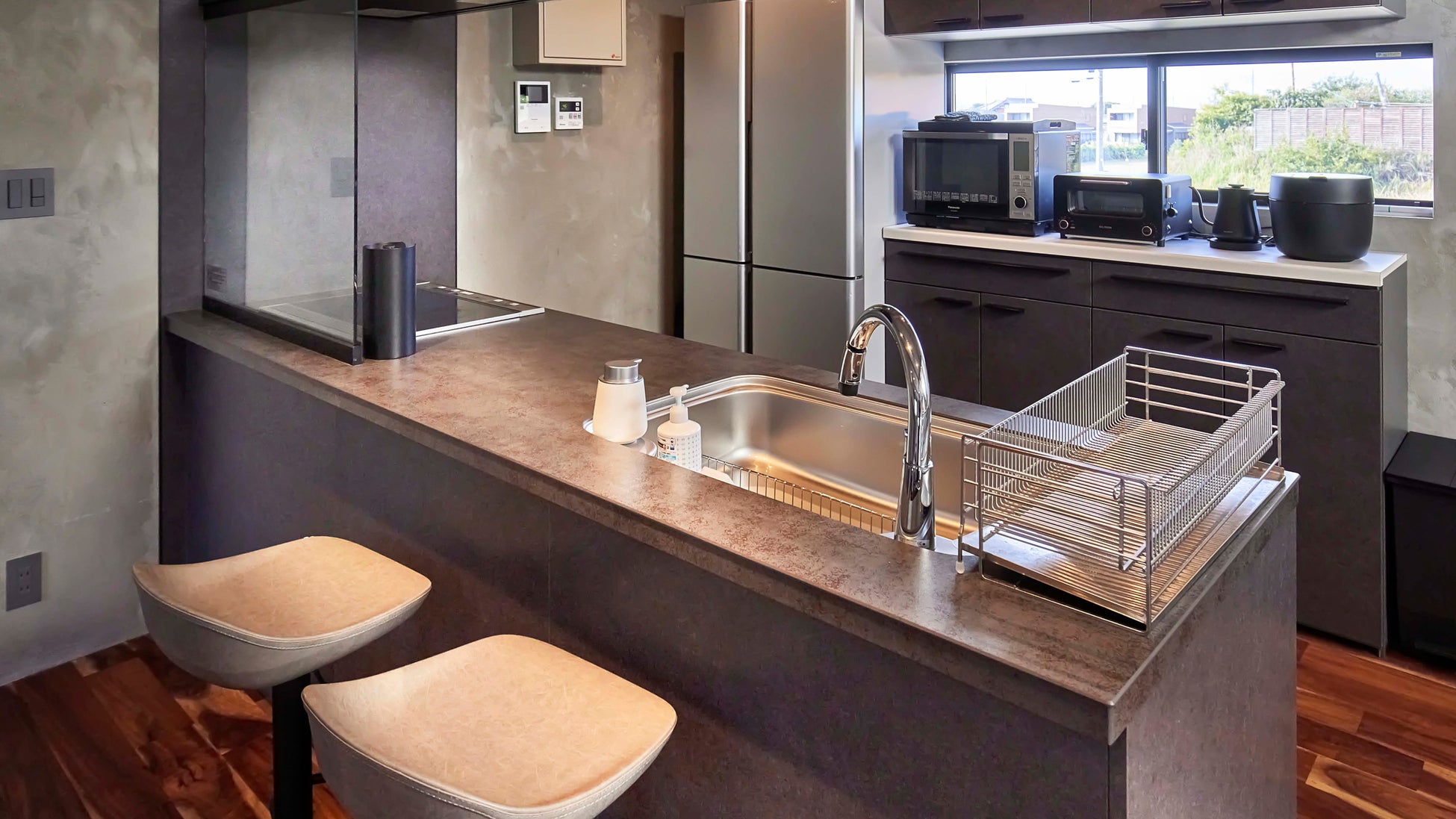リビングにはキッチンも完備され、調理中でも会話が弾む空間に。
